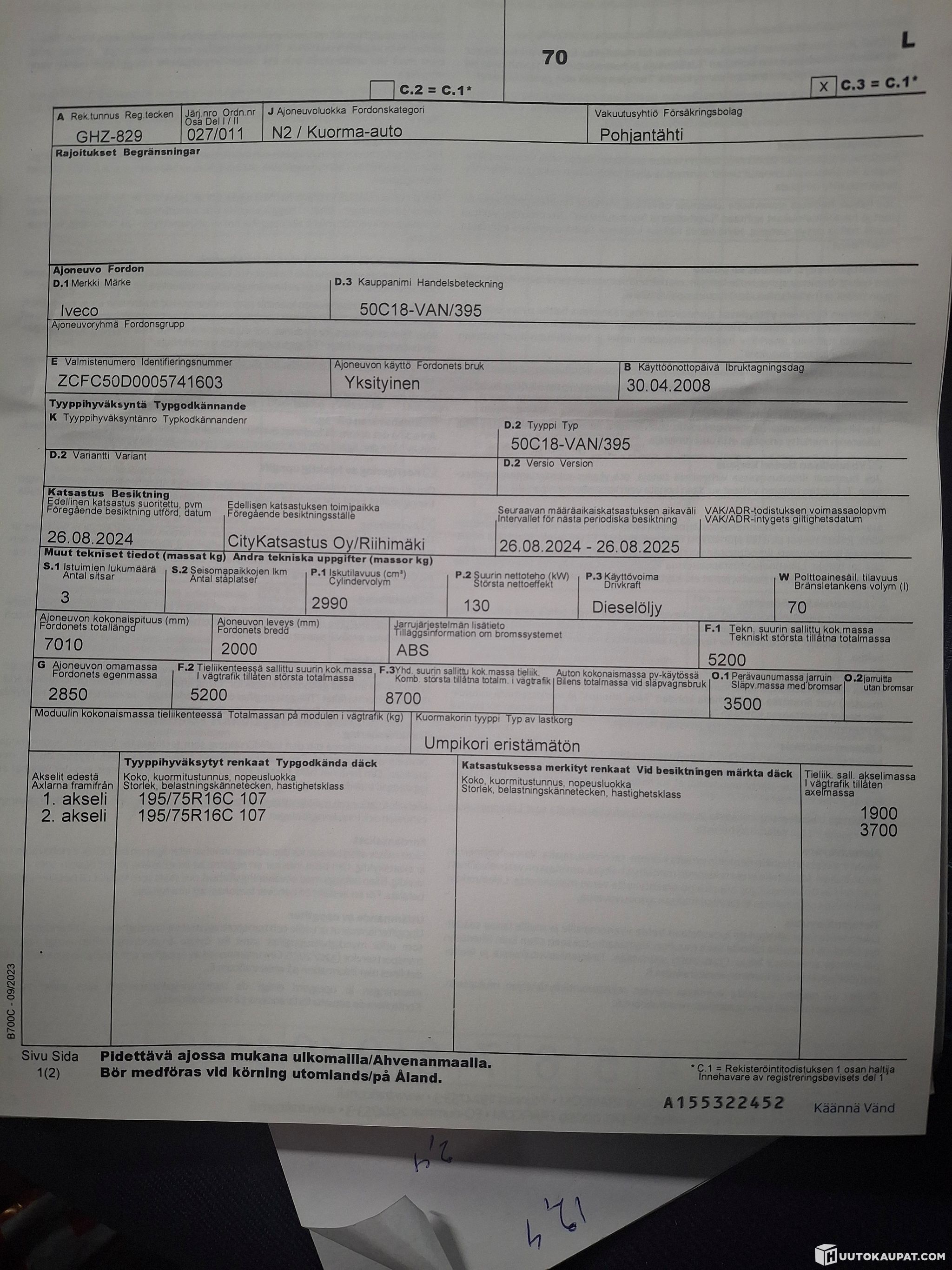 Iveco daily 50c18,katsastus voimassa 8/2026 asti,kolhuja vähän jokapuolella,liukuoven alatiiviste ja takaovien tiivisteitä puuttuu,alla viimetalven ajetut nastarenkaat/hakkapeliitta,vaihdelaatikko alkoi pitämään meteliä joten vaihto tai remontti edessä!!,autossa webasto joka toimii,samoin ilmastointi pelaa,takatilassa vesikiertoinen lämmitin,kuvissa näkyvä lisävalo ei kuulu kauppaan eli poistan sen ,mahdollista ostaa kesärenkaat erikseen jos haluaa/tarvitsee nekin omilla vanteilla.autoon uusittu viime katsastukseen jarrulevyt/palat/kengät.