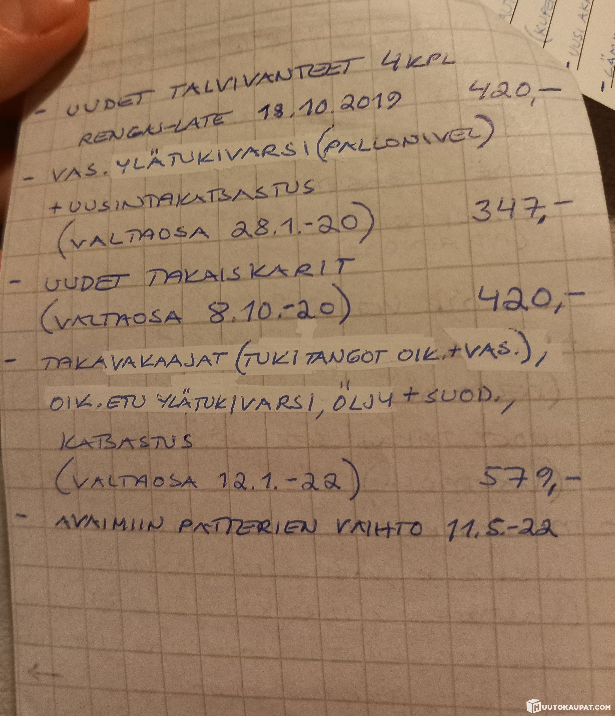 Öljyt ja suodattimet vaihdettu helmikuussa. Mukaan tulevat sekä kesä- että talvirenkaat.
