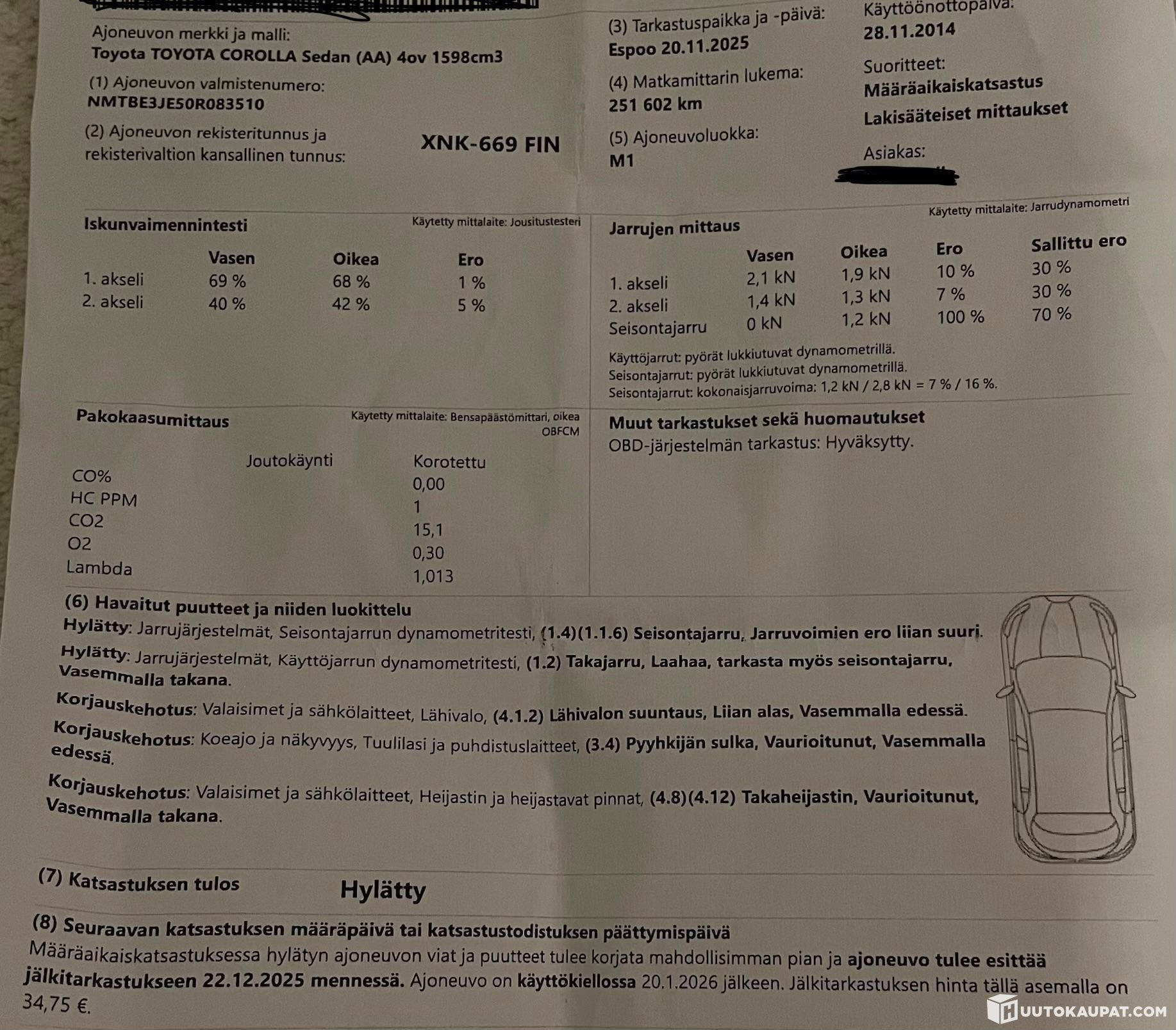 Katsastuksesta hylky: seisontajarru, jarruvoimien ero liian suuri & takajarru, laahaa, tarkasta myös seisontajarru vasemmalla takana. Kts. myös korjauskehotukset kuvasta.
