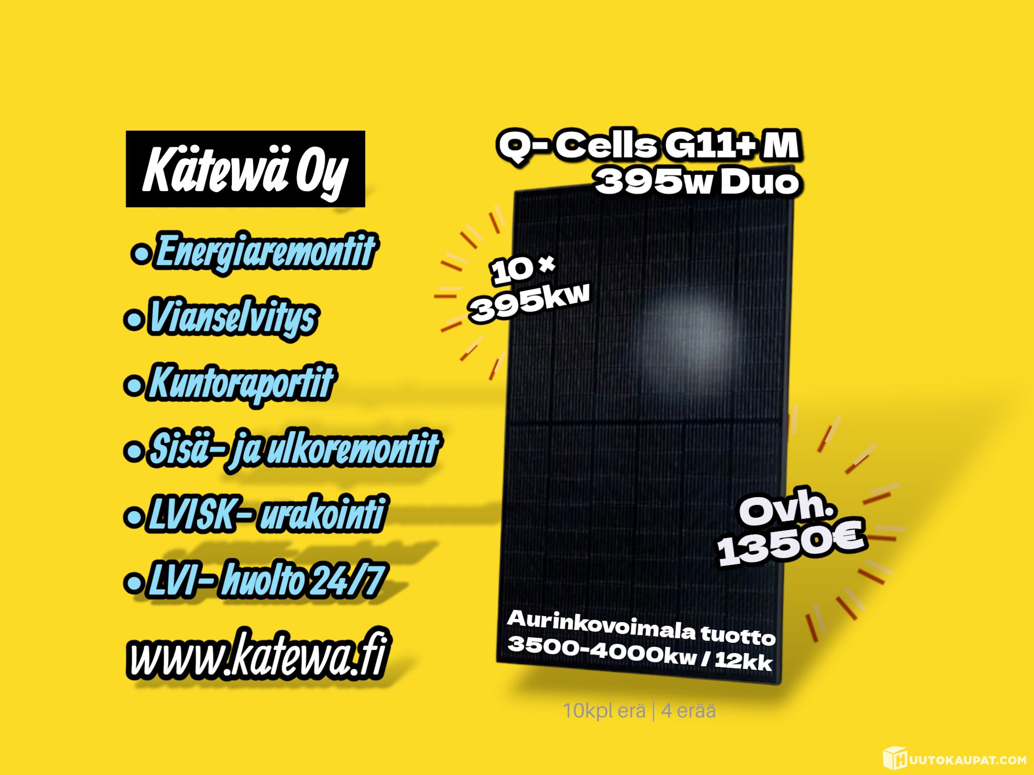 Myydään 10 paneelin erä joka muodostaa noin 4,0 kWp aurinkovoimalan, joka on tyypillinen ja hyvin toimiva kokonaisuus omakotitaloon, paritaloon, mökille.