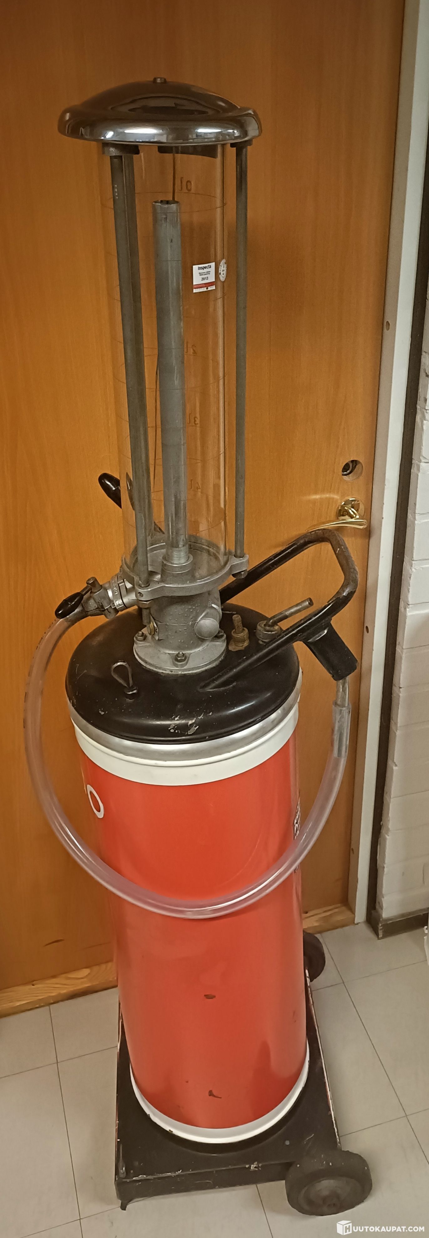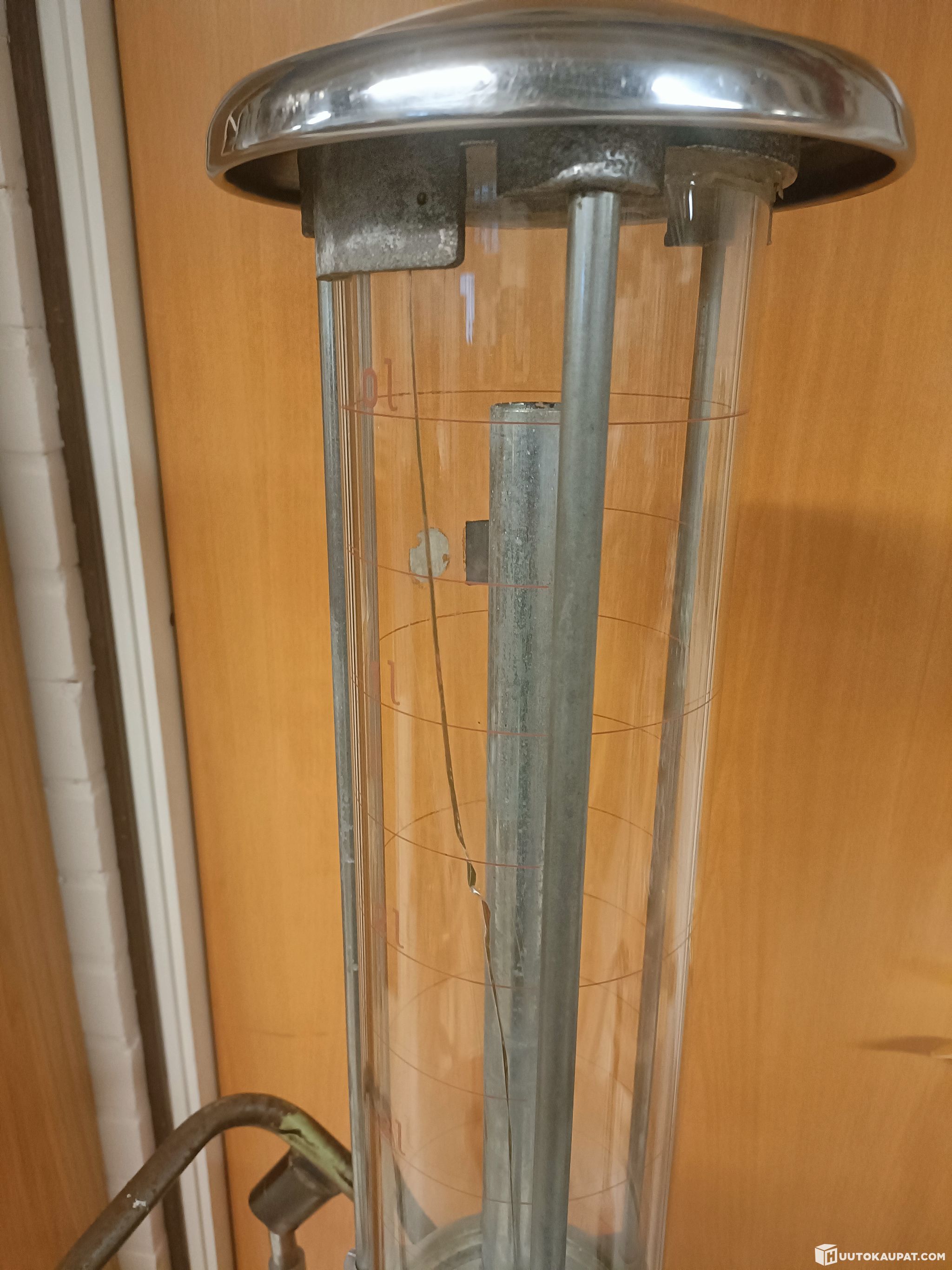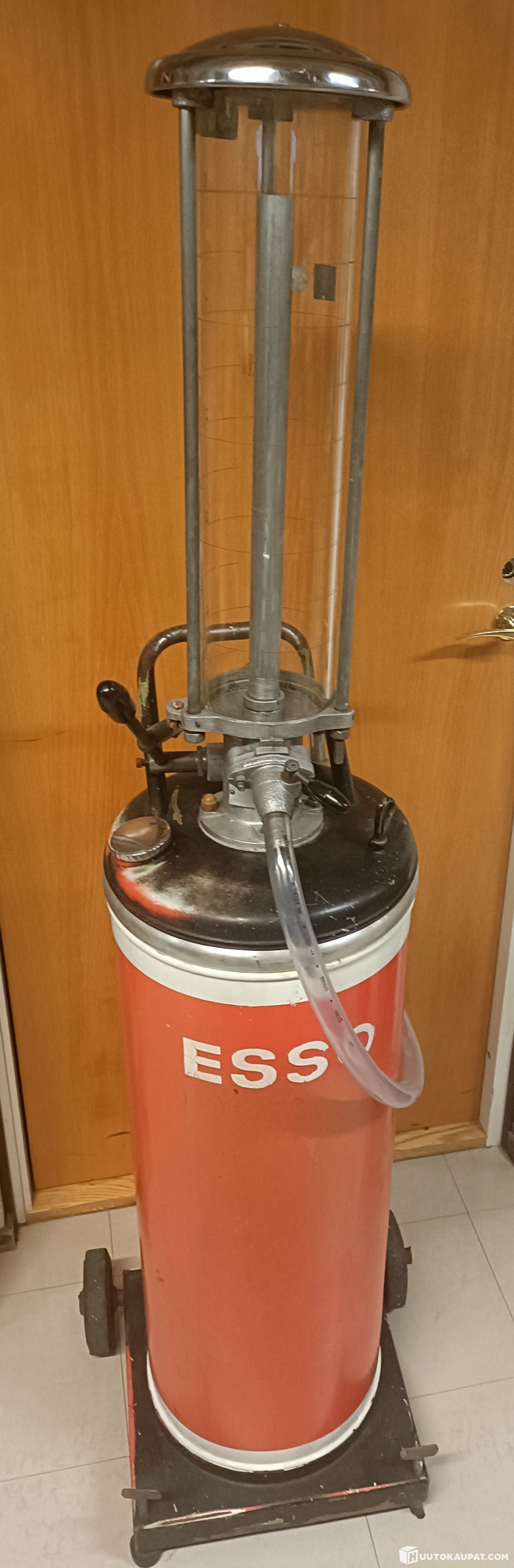 Vanha 2- tahti bensapumppu Esso. Entisöimätön, toimiva, lasissa halkeama ja lasin ylä ja ala tiiviste vuotaa. Seisonut huoltoaseman varastossa, josta tuli minulle. Pumppasin vanhat bensat pois,silloin ei lasin halkeama vuotanut ainoastaan ylä ja ala tiiviste vuoti. Kysymällä saa lisätietoa.