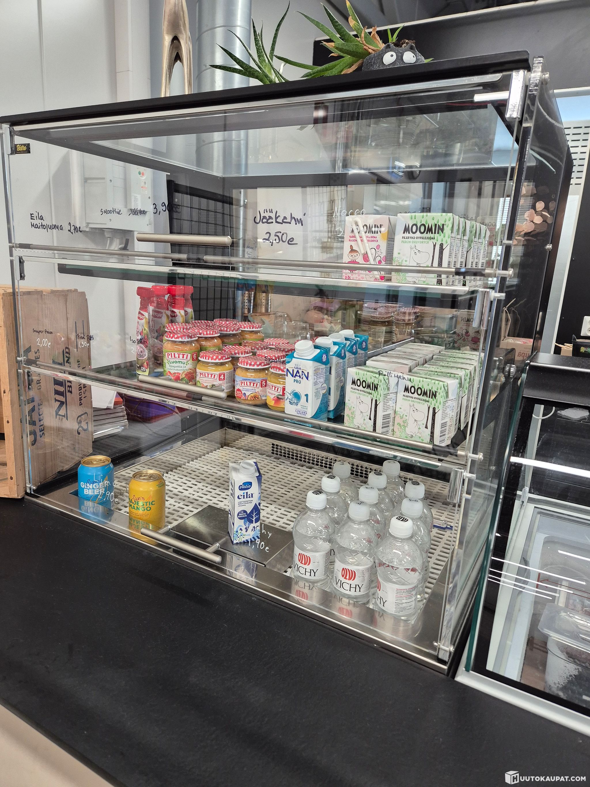 Itsepalvelumalli eli asiakas saa itse otettua vitriinistä tuotteen. Henkilökunnan puolella liukulasit täyttöä varten ja alla lisäjääkaappi. Leveys 80 cm.