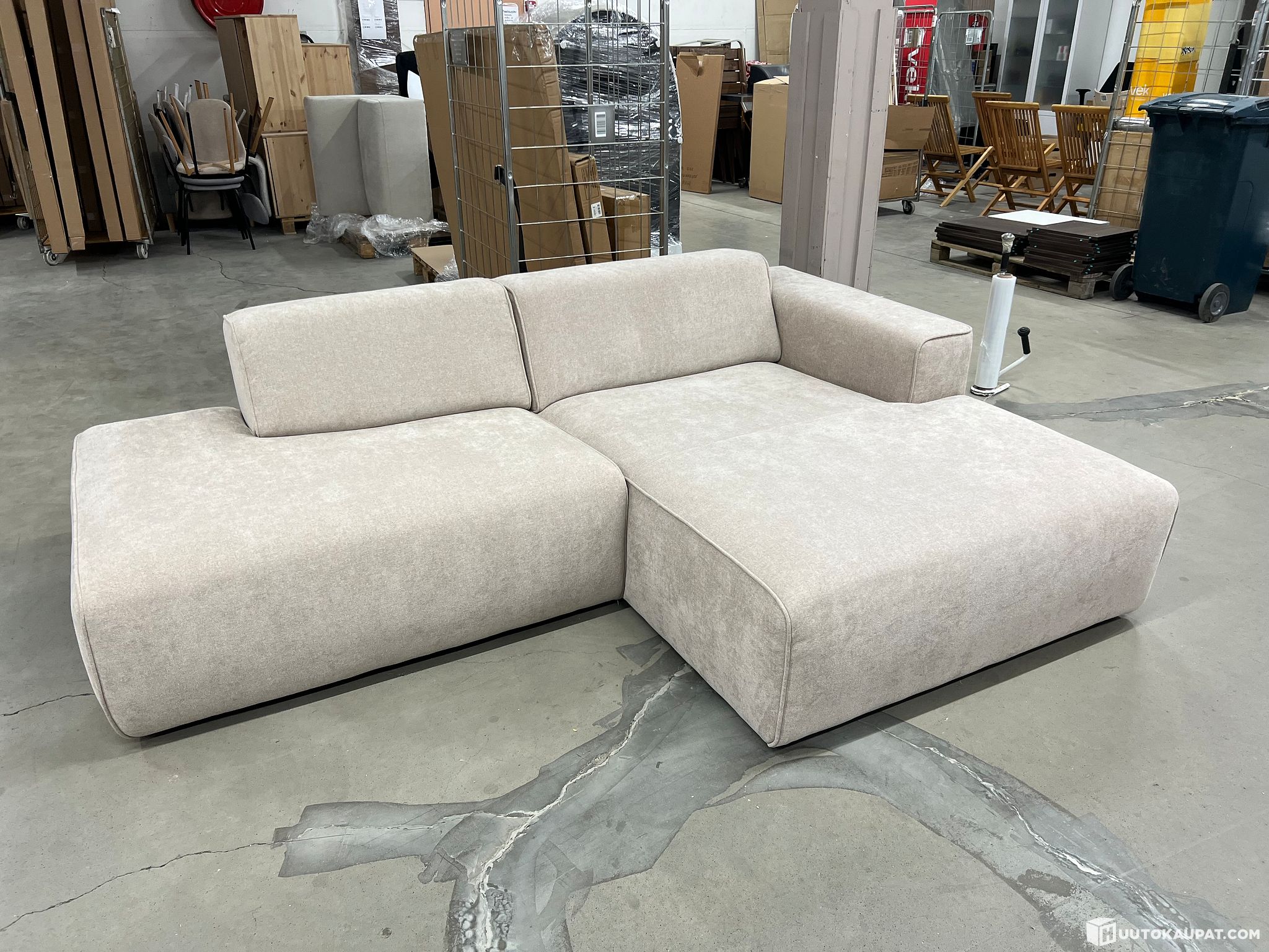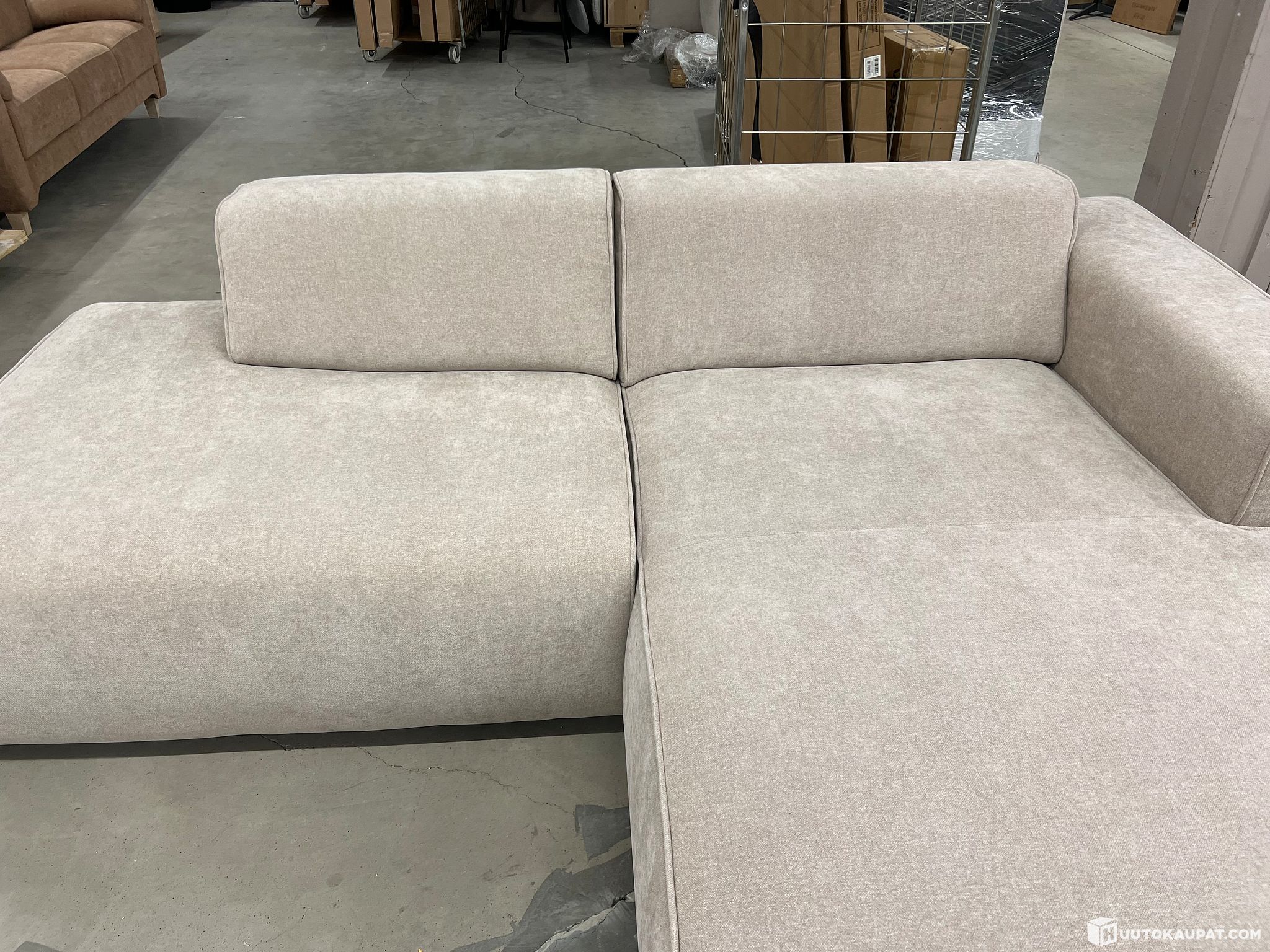 Asiakaspalautus. Sohvan runkoa korjattu. Sävyeroa moduuleissa, divaaniosa ollut käytössä. Avopäätyosa on normaalia lyhyempi, jonka vuoksi mitat (leveys) eivät ole todenmukaisia.