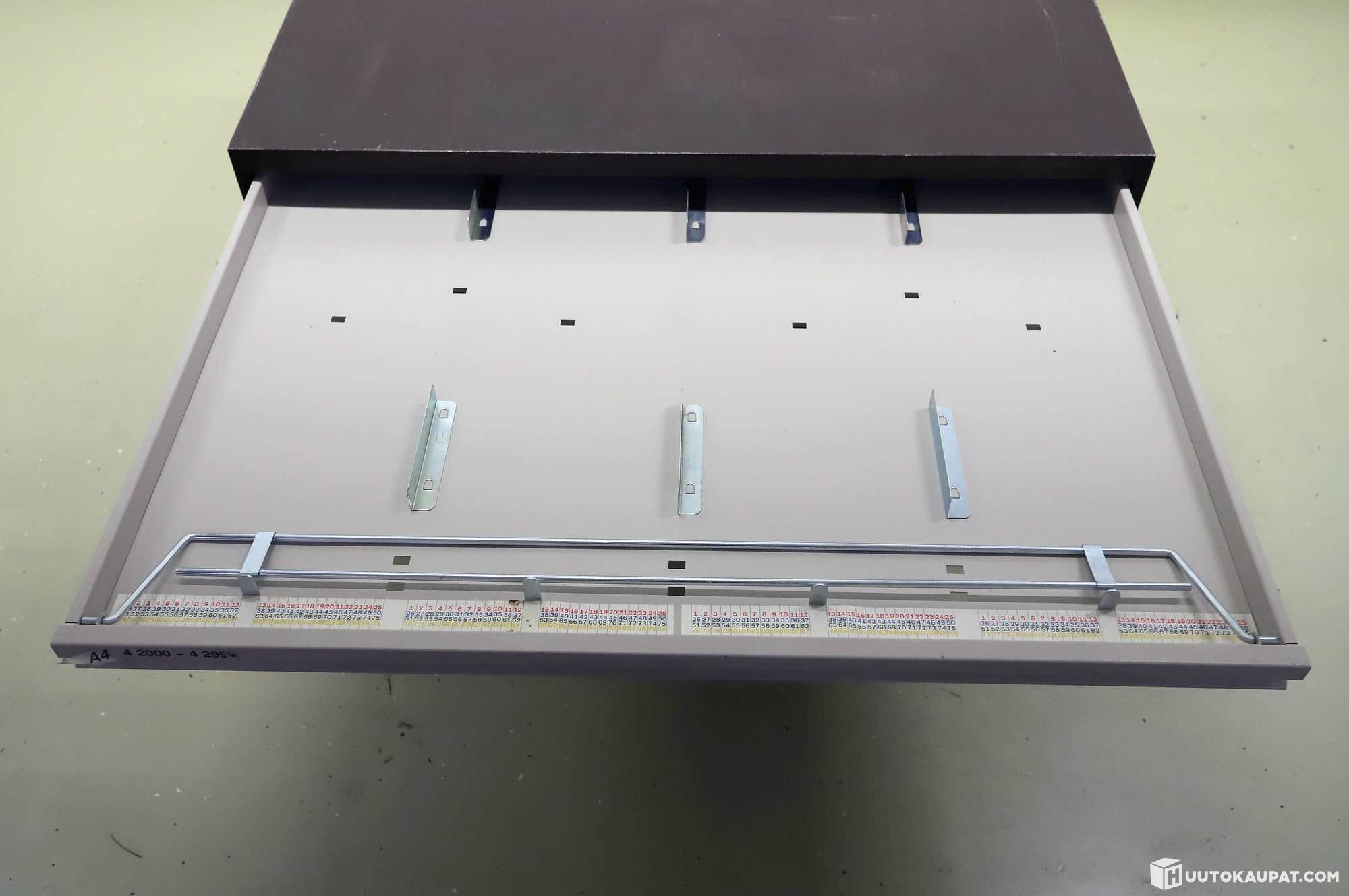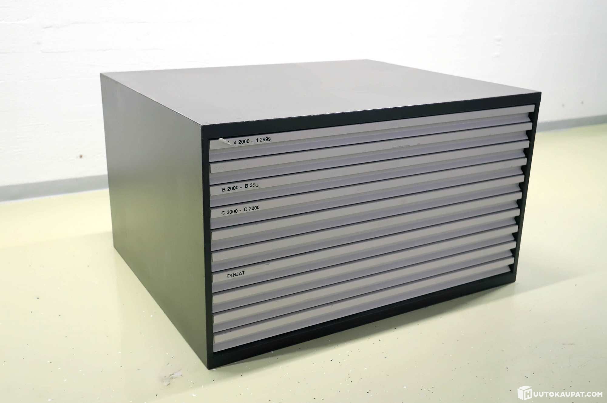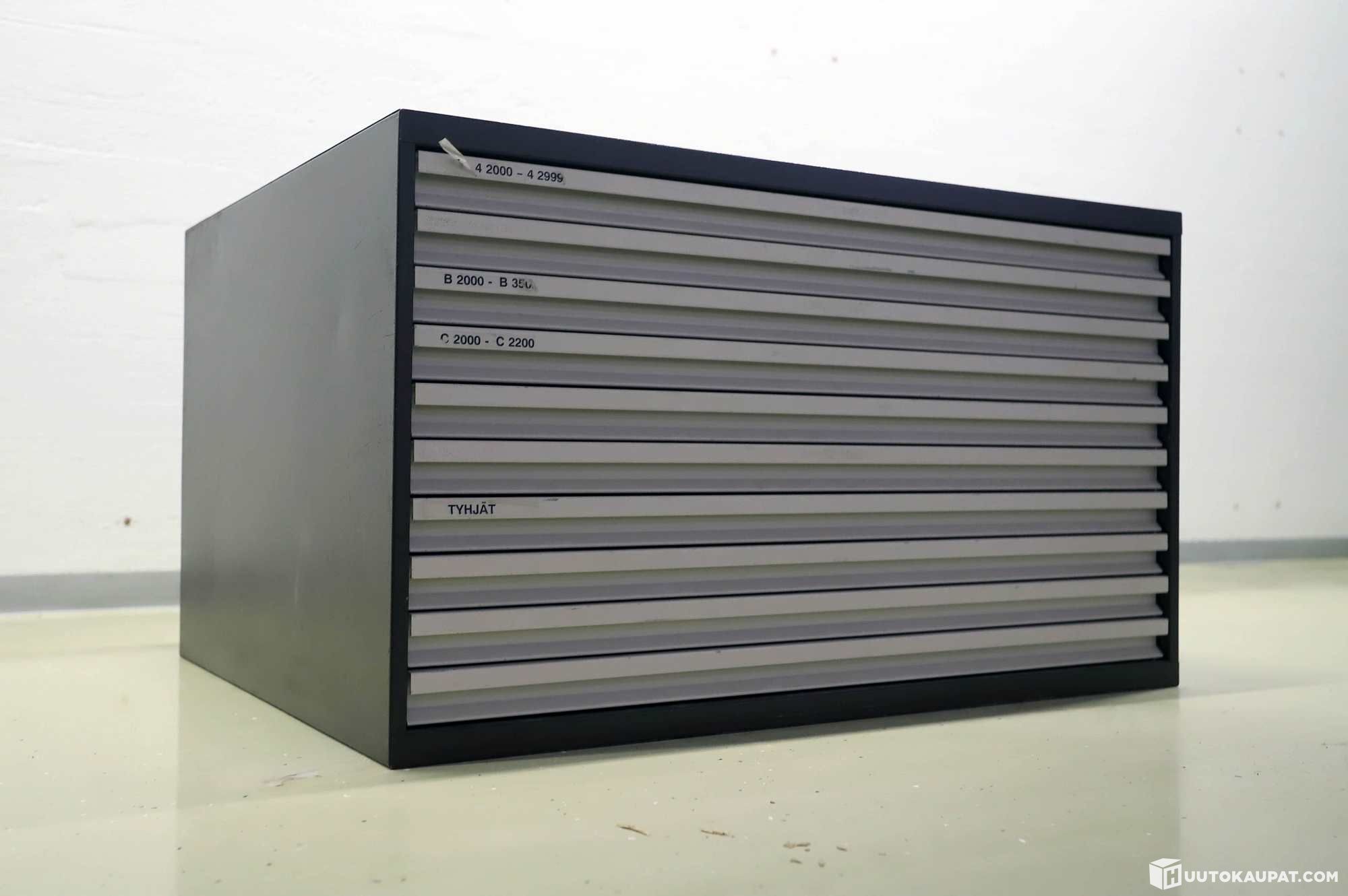 Metallinen karttalaatikosto. Ideaalinen monenlaiseen keräilyyn (perhoset, rahat, pullonkorkit, tms).