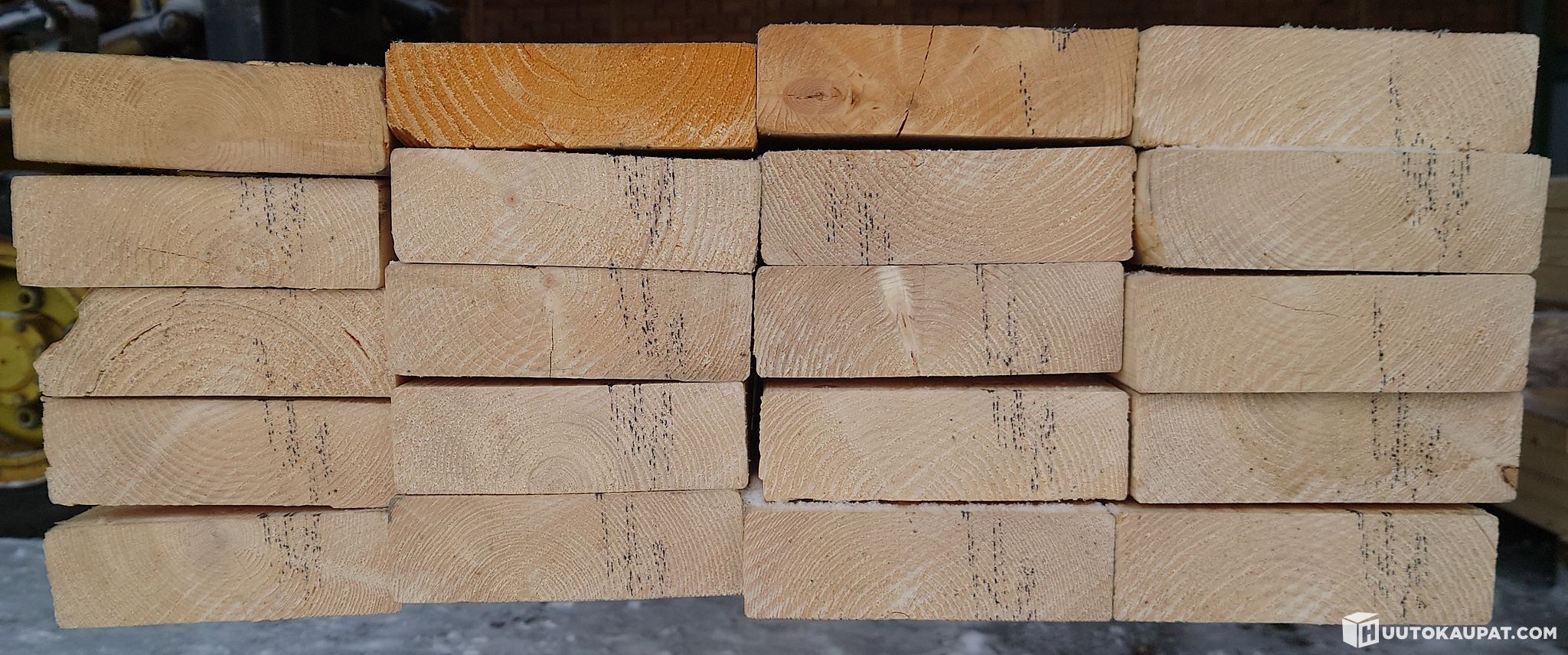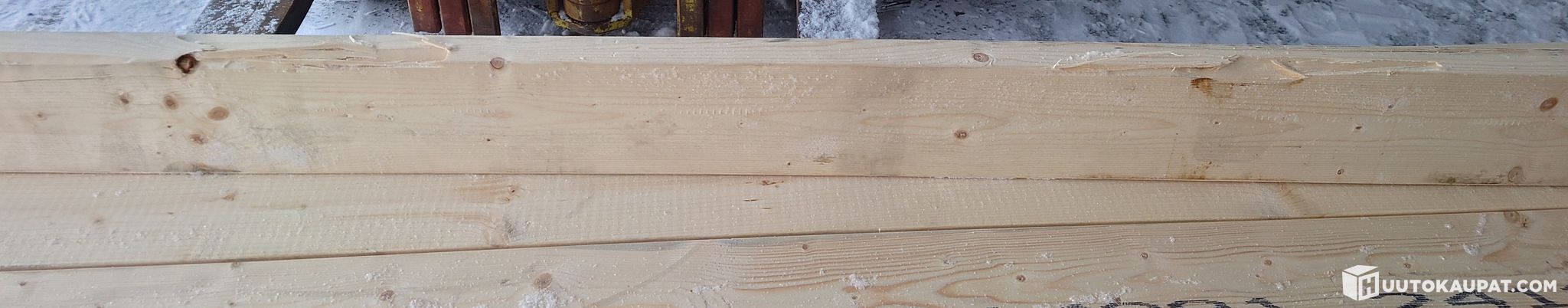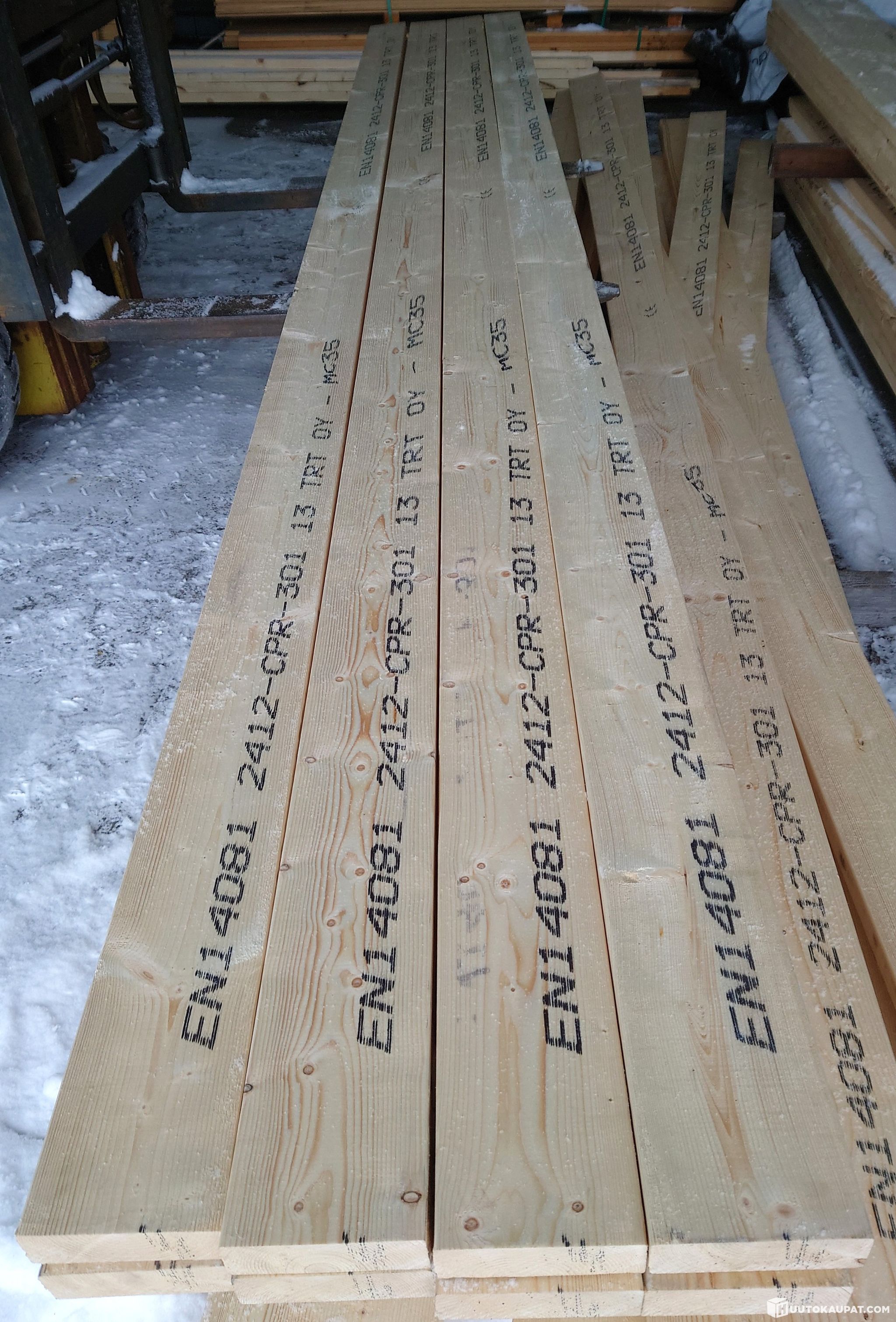 Kuvissa esitelty 20 kpl erä 42x145 koneellisesti lujuuslajiteltuja ja CE-merkittyjä lankkuja 95,4 m. Lankuista 17 kpl ovat parasta laatua MC 35 ja 4,8 m pitkiä. Ylimmän kerroksen tasaamiseksi lisättiin yksi 3,9 ja 4,5 m sekä 5,4 m pitkä lankku. 5,4 m pitkässä on trukin piikkien aiheuttamat vauriot kyljessä - ks. viimeinen kuva.