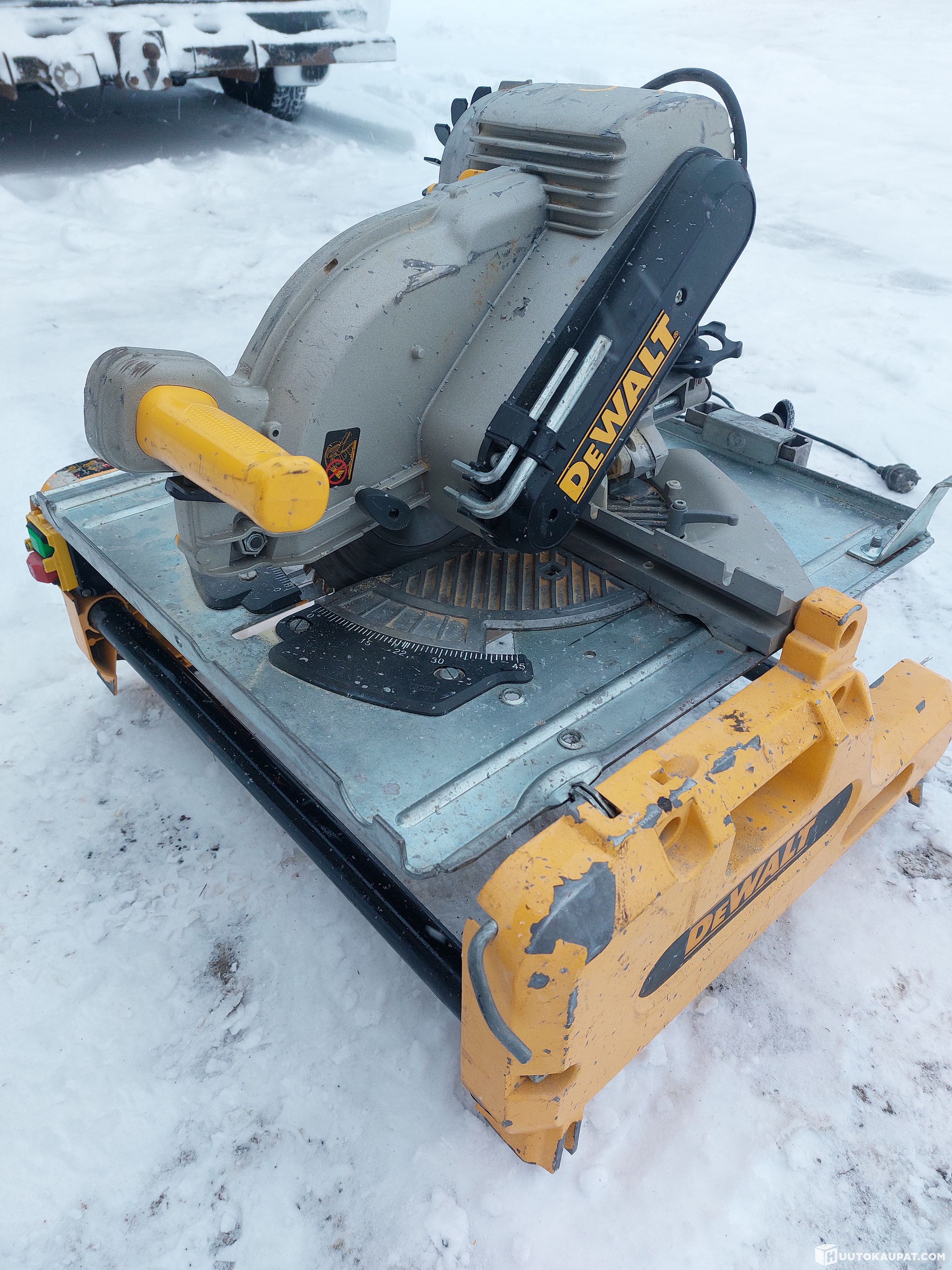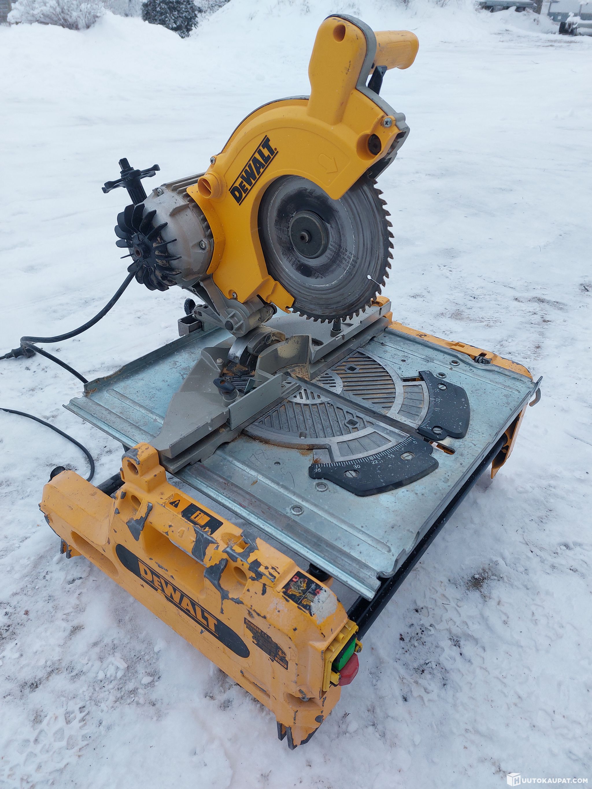 Dewalt kääntöpöytäsirkkeli. Jalat ja teräsuoja puuttuvat. Muuten toimiva.