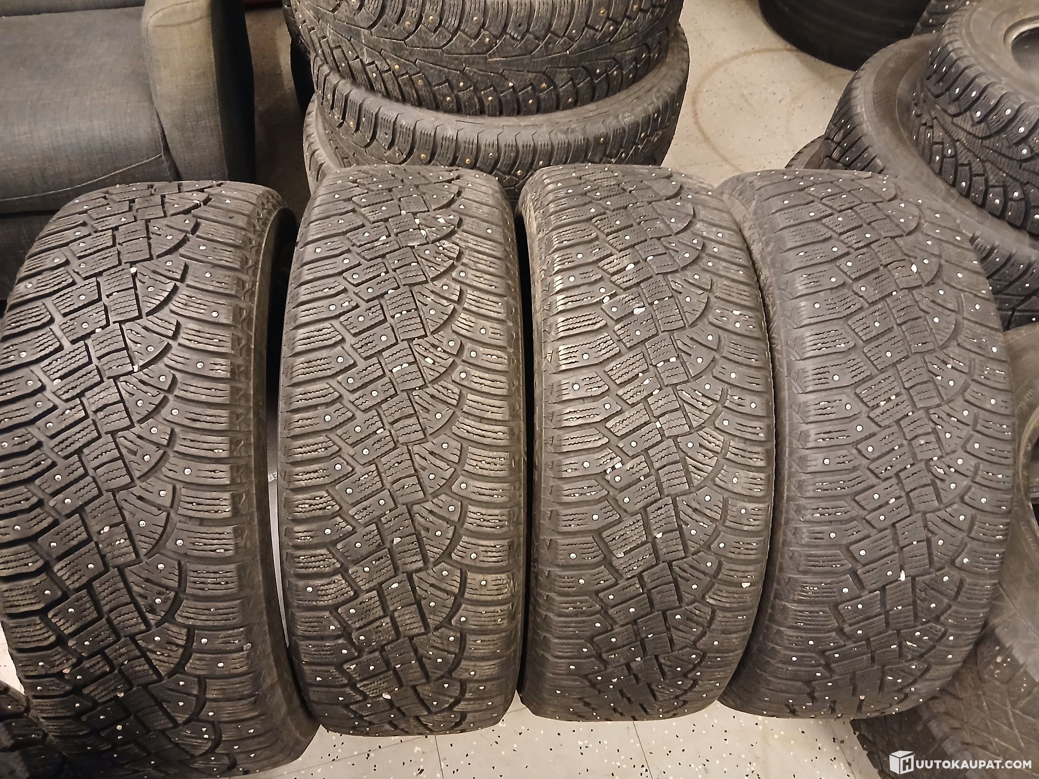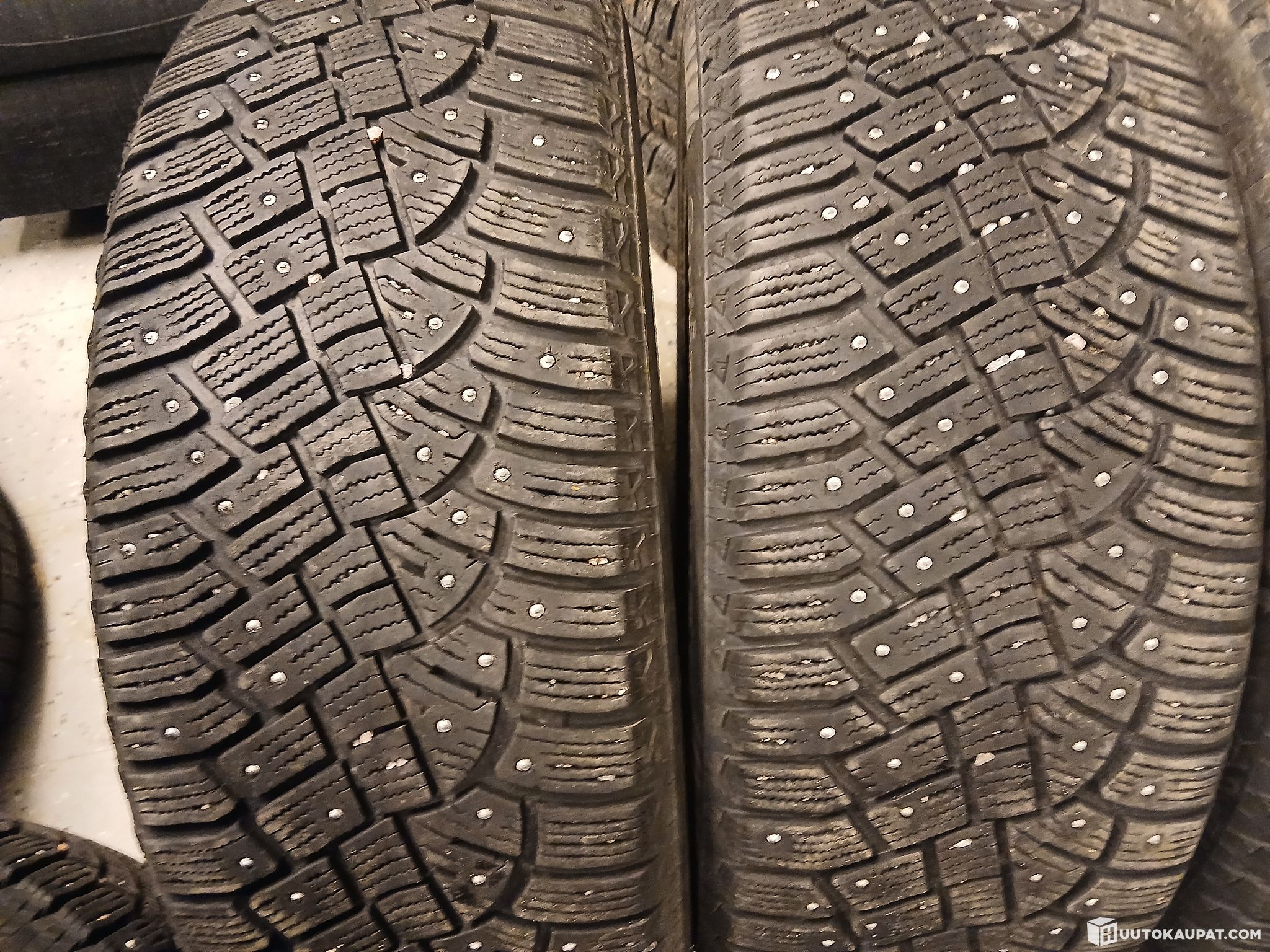 Käytetyt renkaat. Joku nasta puuttuu.