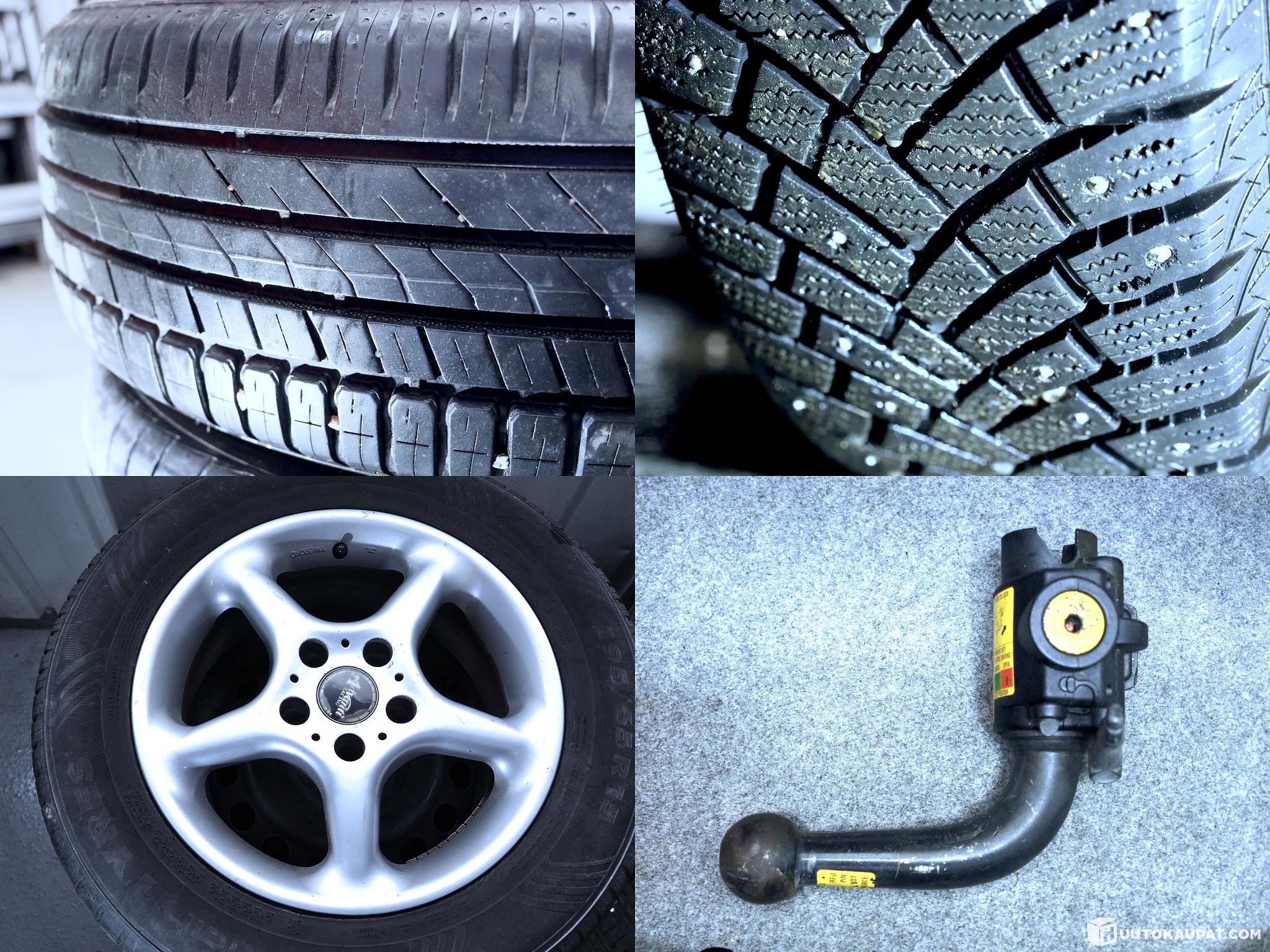 Kahdet renkaat, joissa molemmissa sarjoissa mukavasti pintaa. Huolto- ja käyttöohjekirja ovat säilyneet tallessa samoin kuin kaikki avaimet (3 kpl) sekä lisäksi irrotettavan vetokoukun avain.
