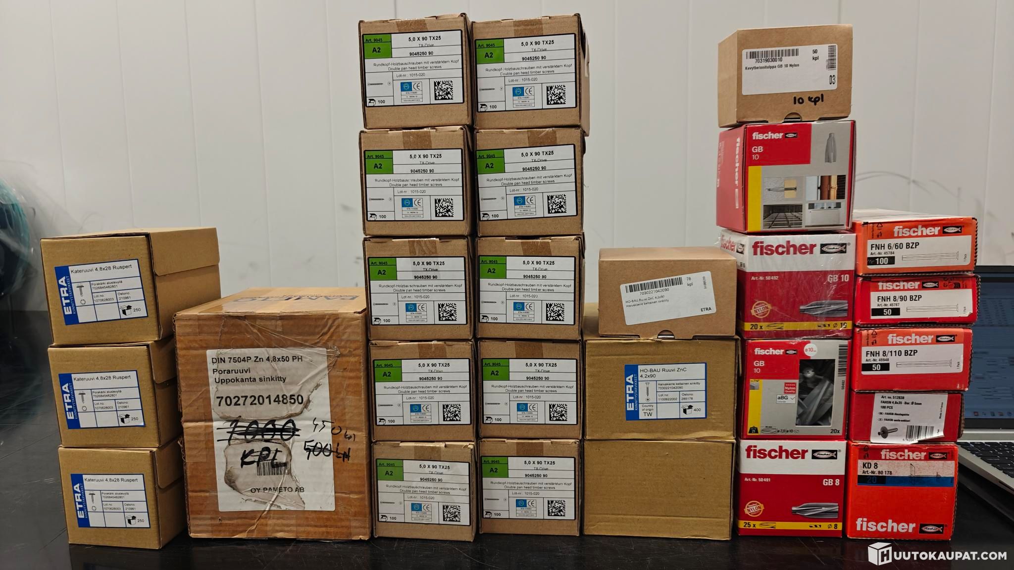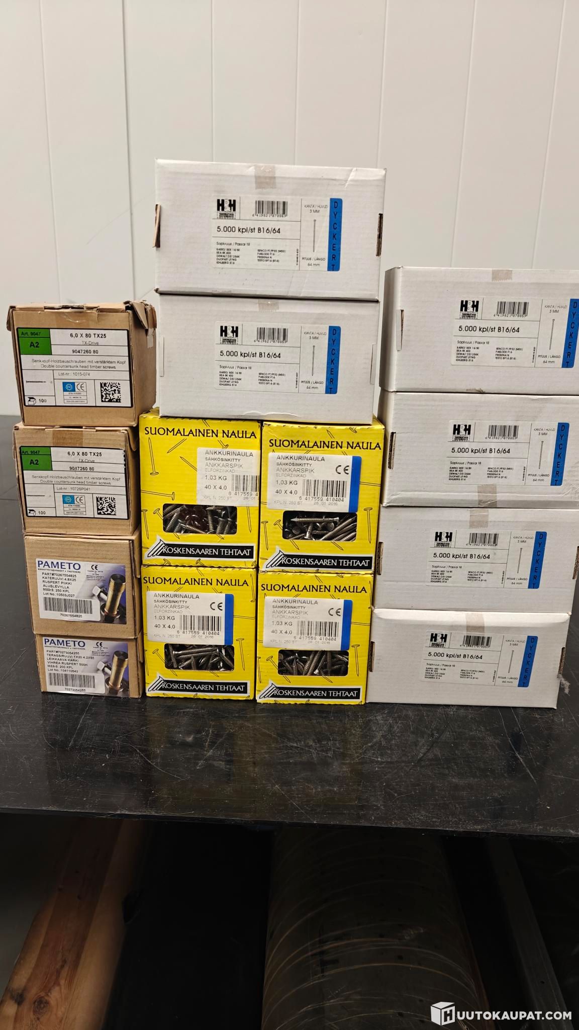 Erä hyvin sekalaisia kiinnitystarvikkeita. HUOM! Osa pakkauksista rikkinäisiä/avattuja, joten määrät ovat suuntaa-antavia, ja voivat heittää ilmoitetusta. Tarkempi sisältö alla.
