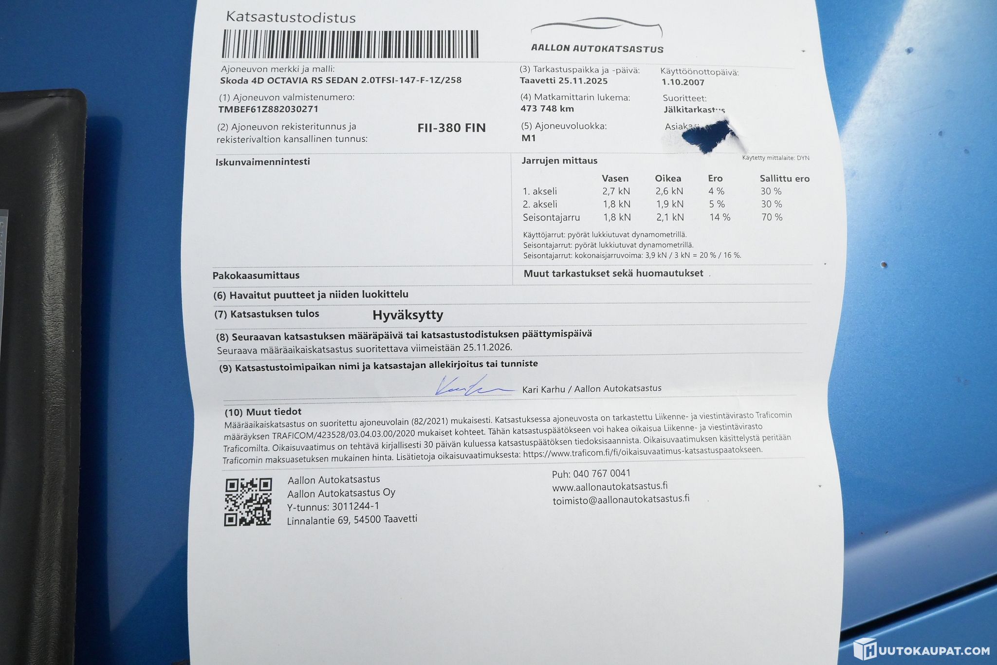 Edellisellä omistajalla vuosina 2013-2026 palvellut sininen RS Octavia seuraavalle! Auto on katsastettu marraskuussa eli leimaa löytyy vielä 11/2026 asti!