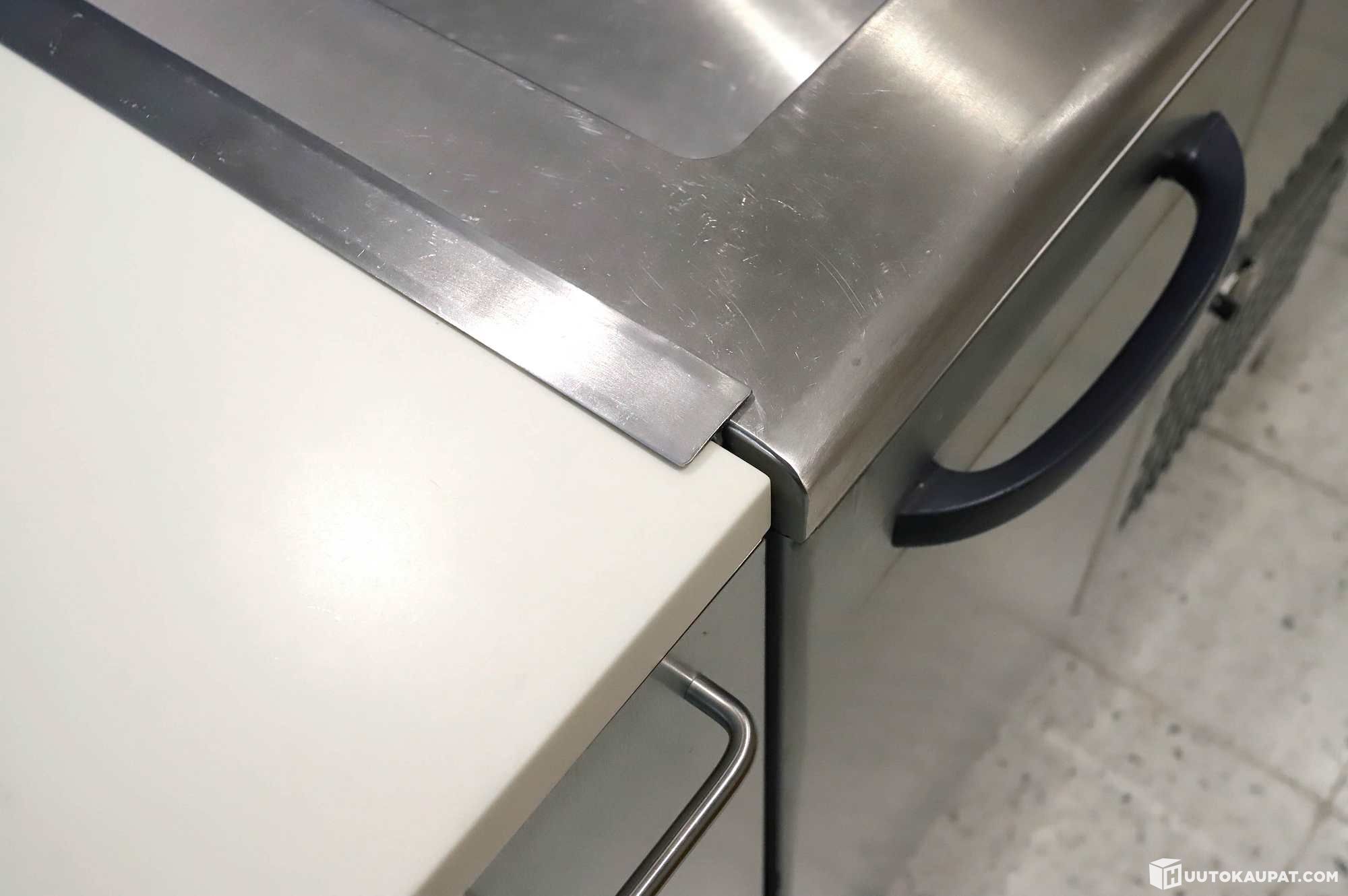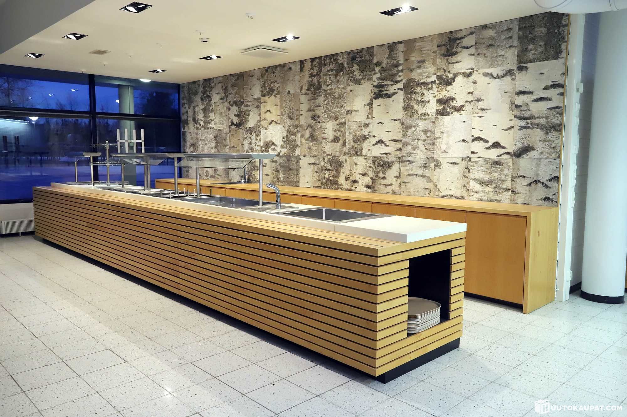Tarjoilulinjasto Metos-laitteilla. Mitat: tason korkeus 85cm / 90cm, pituus 700cm, syvyys 98cm.