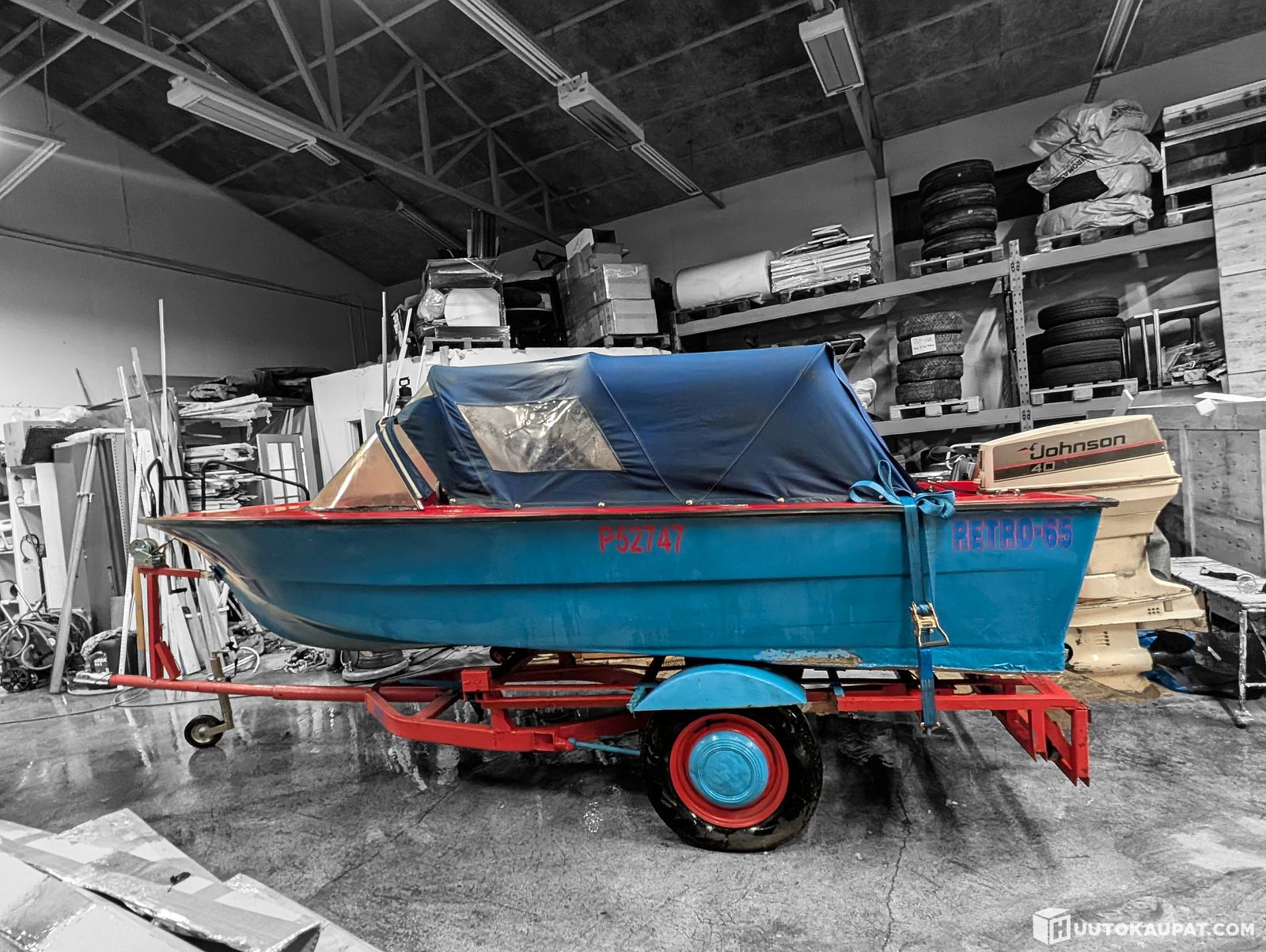 Tuulilasivene Retro-65 (1965) + Wartburg 311-traileri (1971) Sis. Perämoottori Johnsson 50hP, Järvenpää