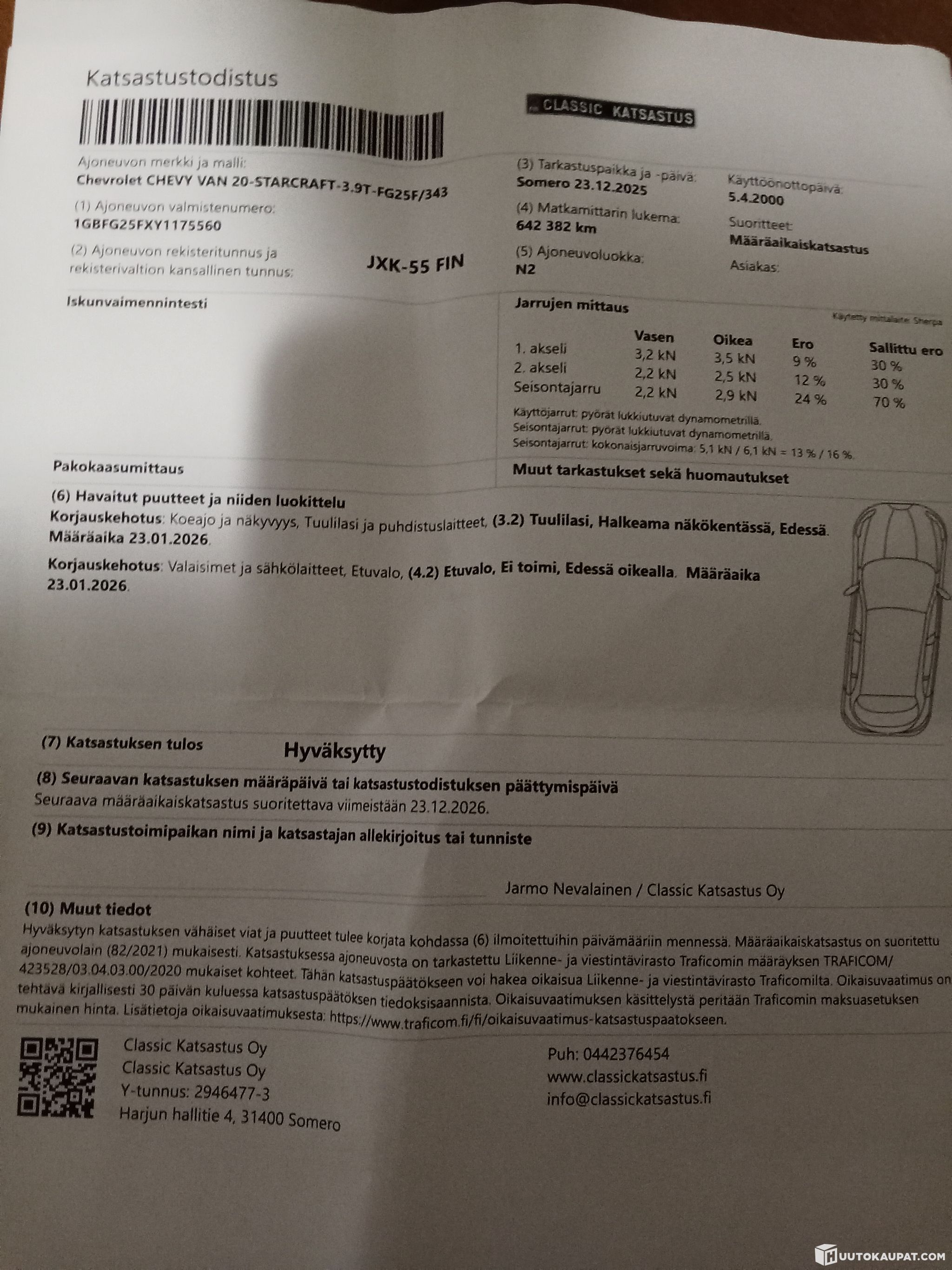 Katsastettu 12/2025 (huomautukset vain tuulilasista ja parkki valosta).
