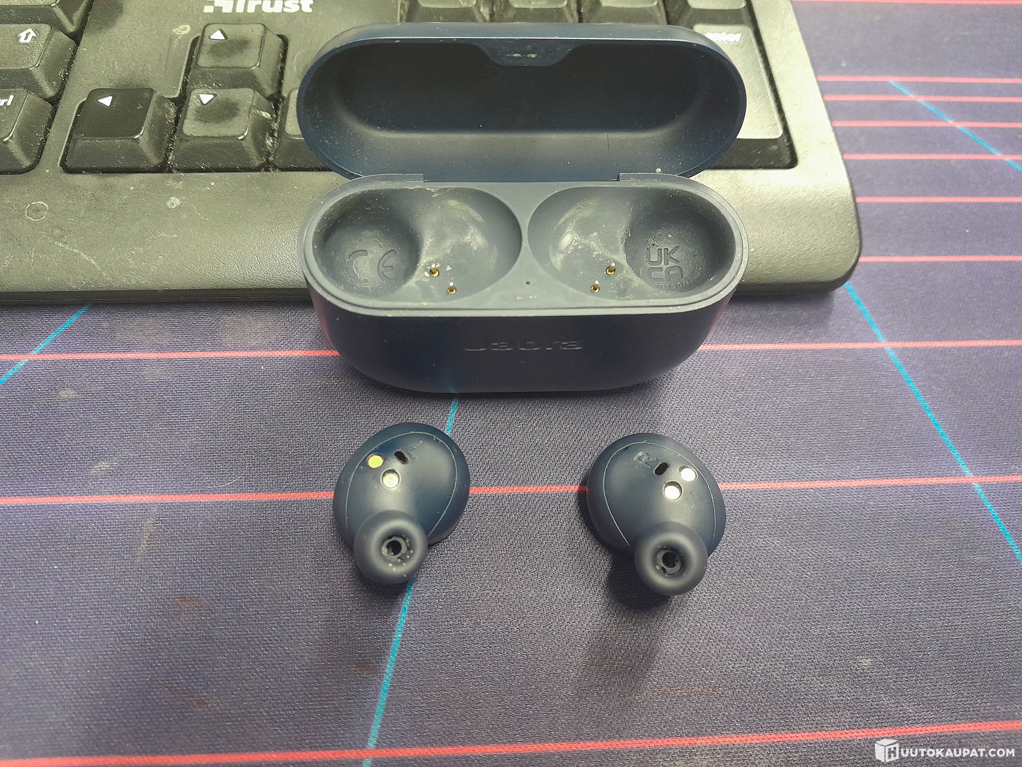 Käytetyt, mukana napit, latauskotelo ja laturi.