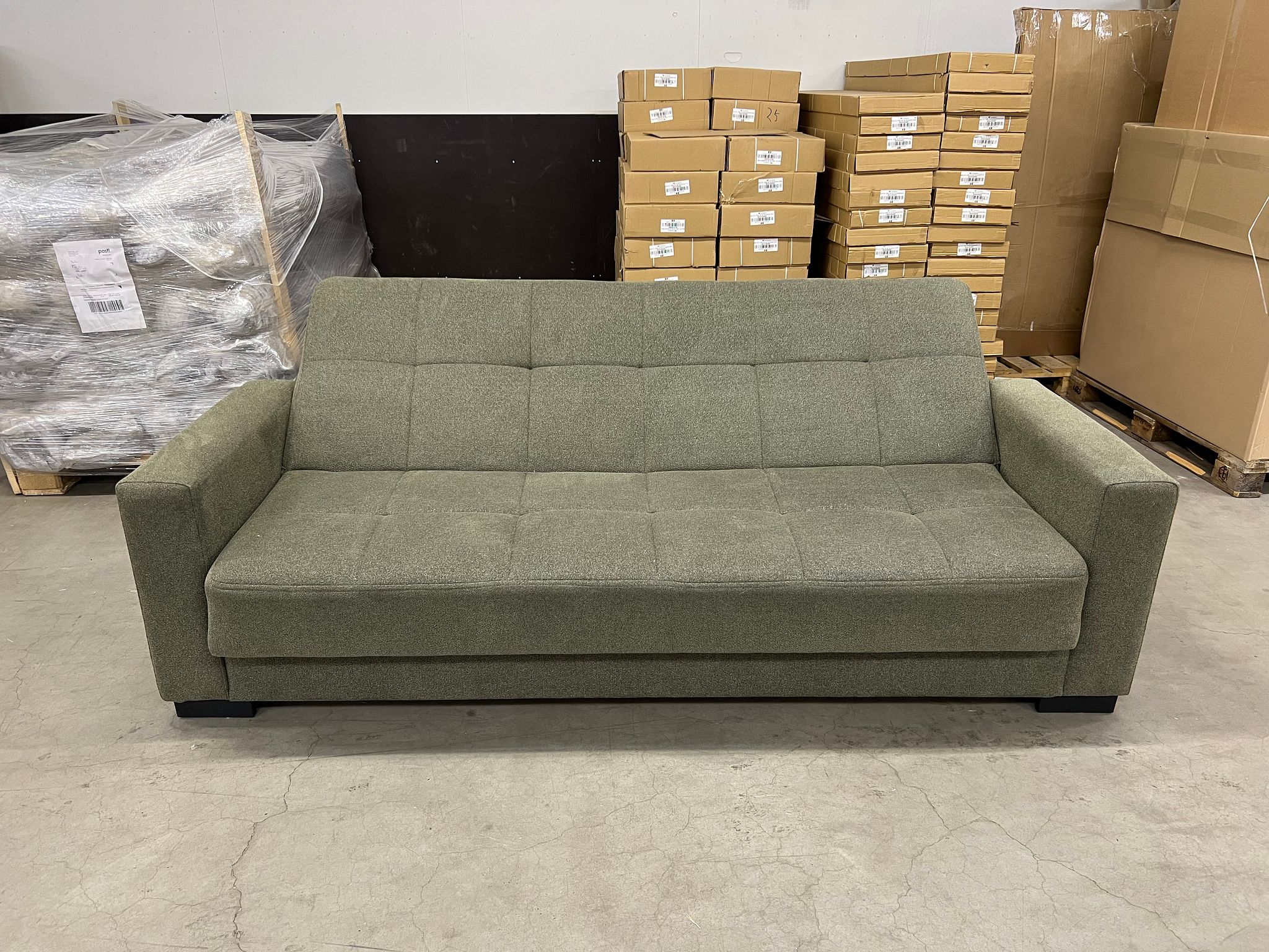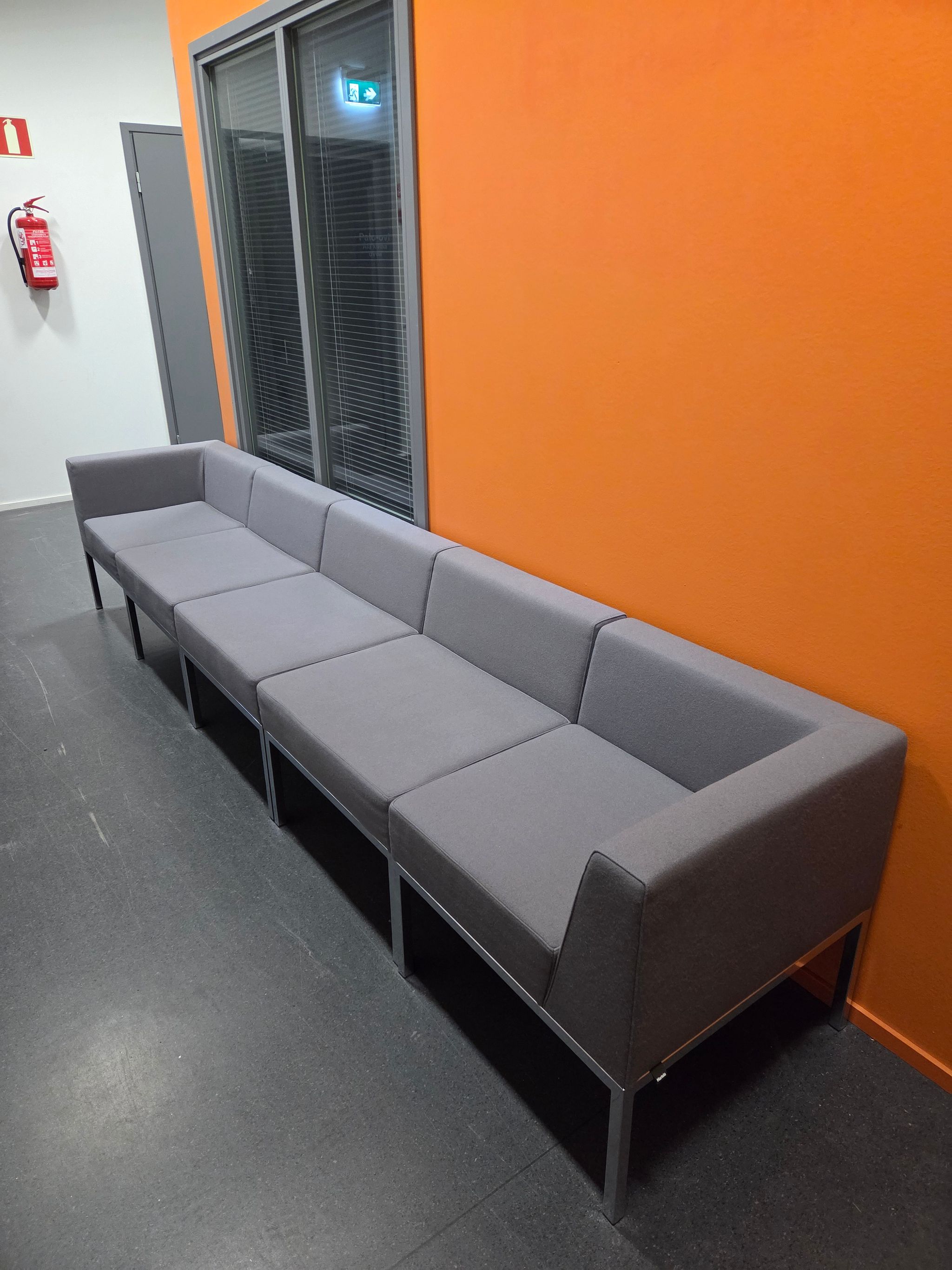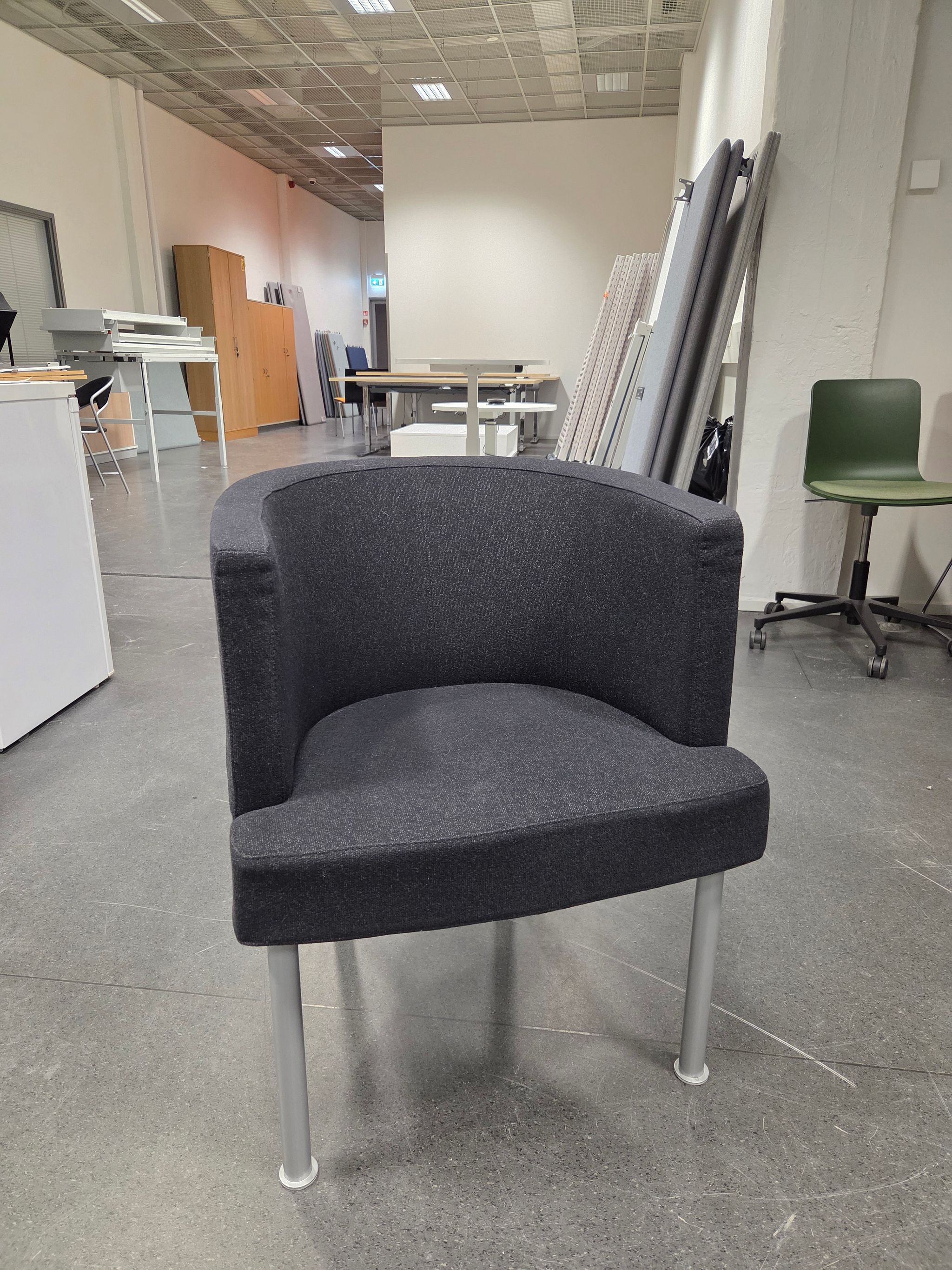 Kinnarps sohva, musta harmailla jaloilla (irtotyynyillä). Mitat: 80 x 205, syvyys 70