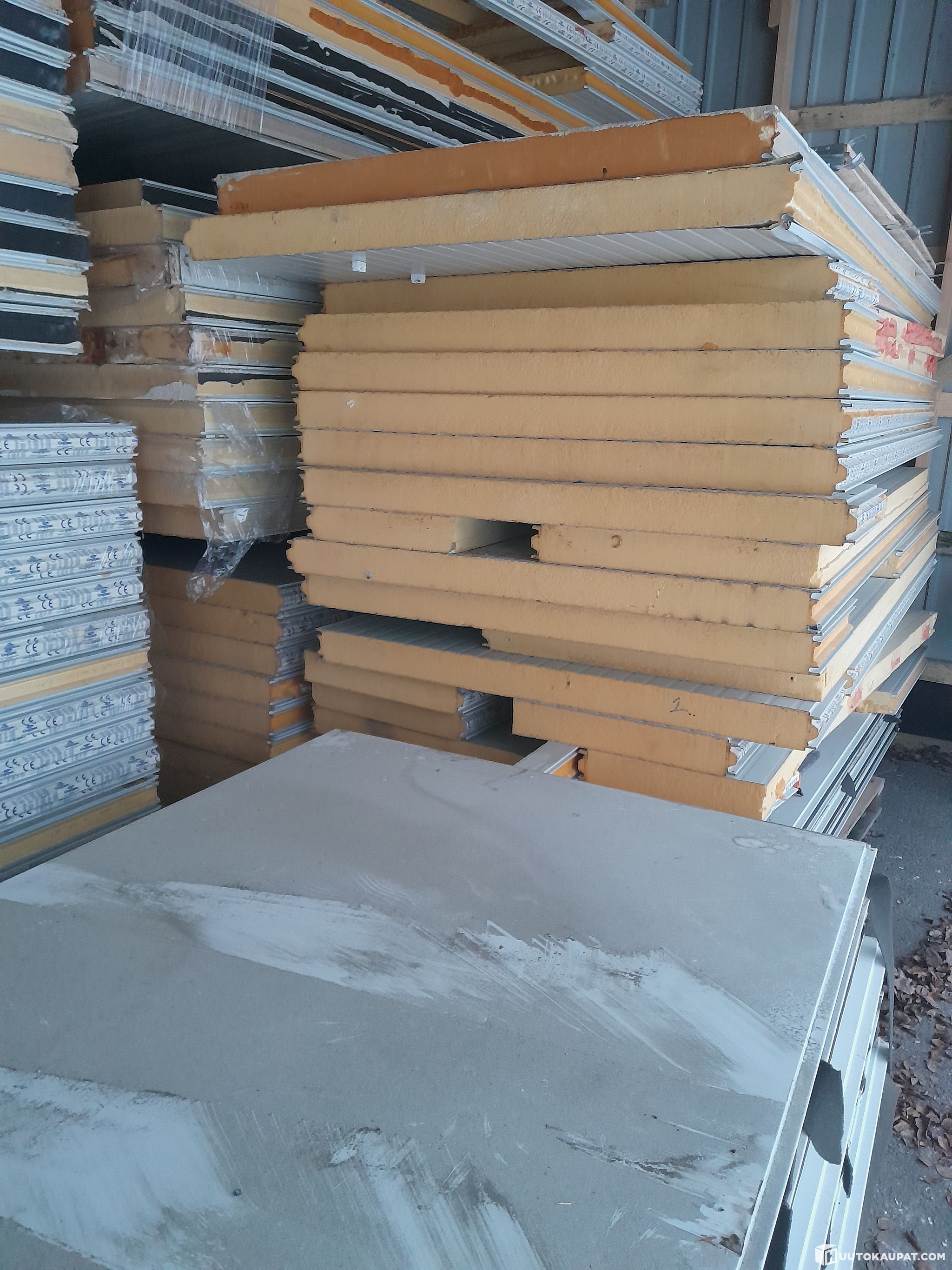 Käytöstä poistettuja uretaanielementtiä, joissa vaakasaumassa pontti. Ovat olleet kylmiön elementteinä, ja sieltä purettuja. Käytössä olleet noin 2-3 vuotta. Elementit siistiä, mutta toki purettaessa ja kuljetettaessa on pieniä jälkiä varmasti syntynyt. Kaikki elementit eivät ole kokonaisia, vaan osa on leikattuja. Alla vielä mittoja