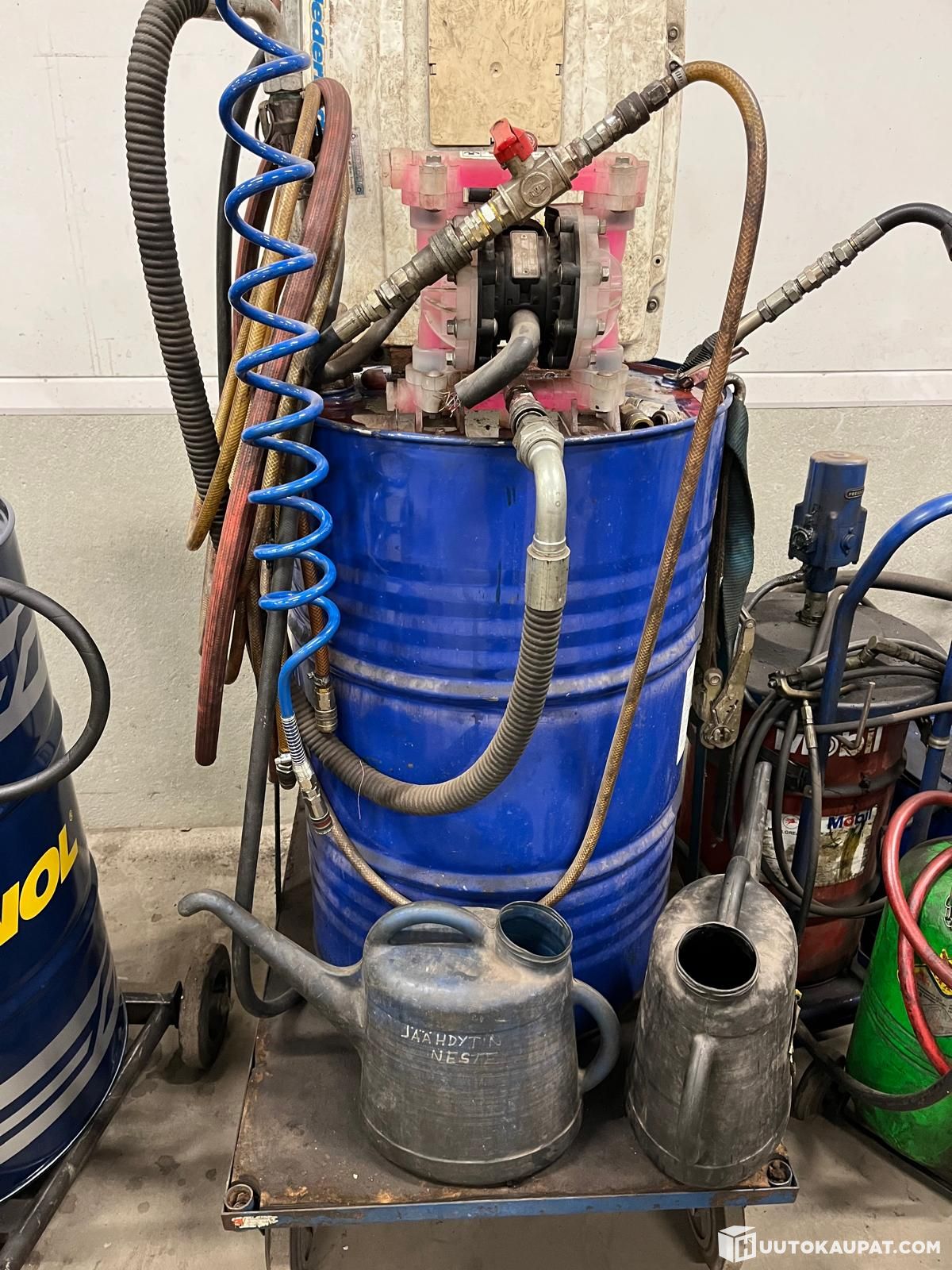 Toimivat Öljytynnyri-, Pakkasnesteen pumppu ja tynnyri, lasinp., vaihteiston öljyntäyttö, öljykannuja, rasvarin täyttö, rasvaus- ja jäteöljyn pumppu ja jäteöljynsäiliö.