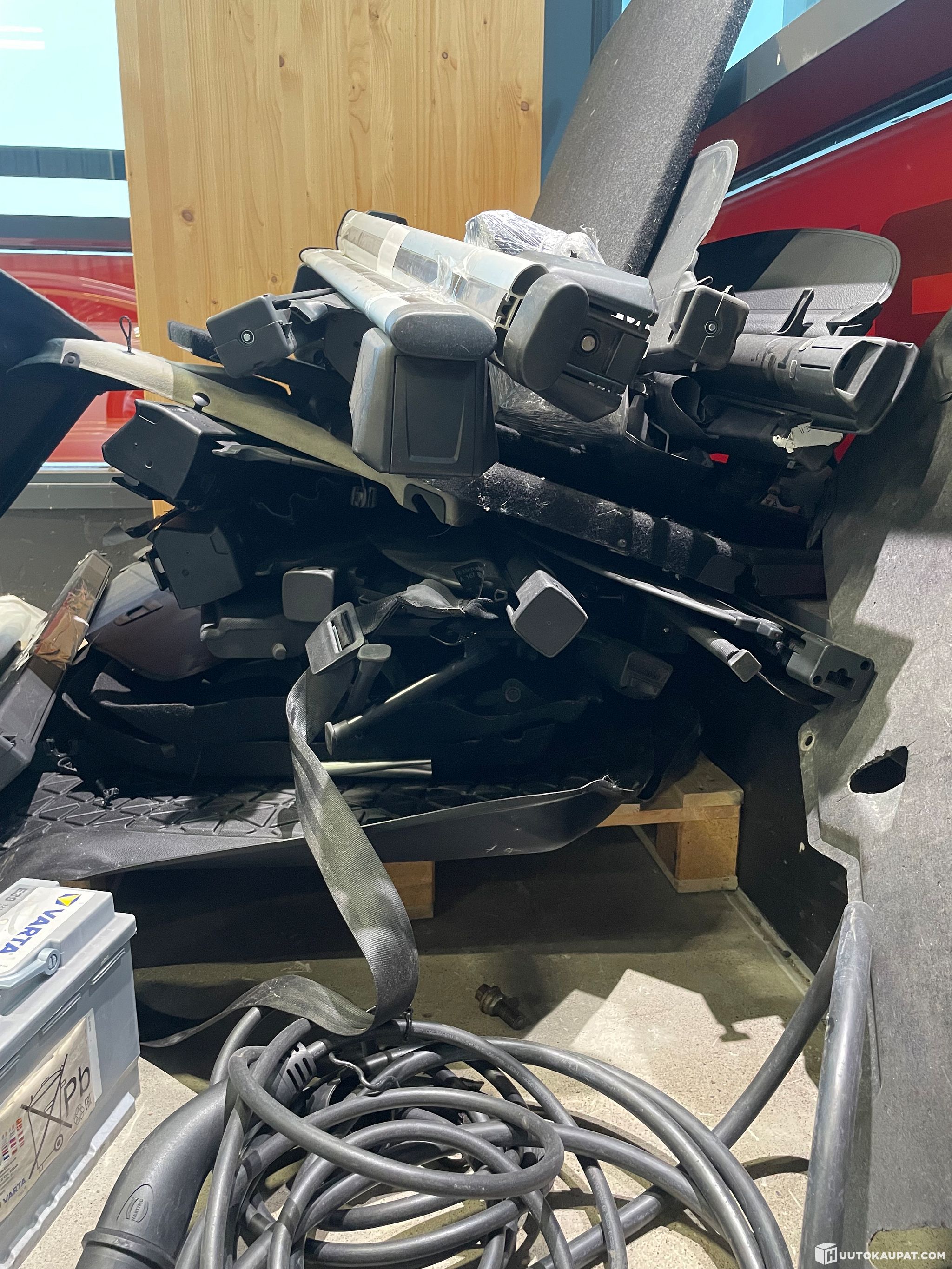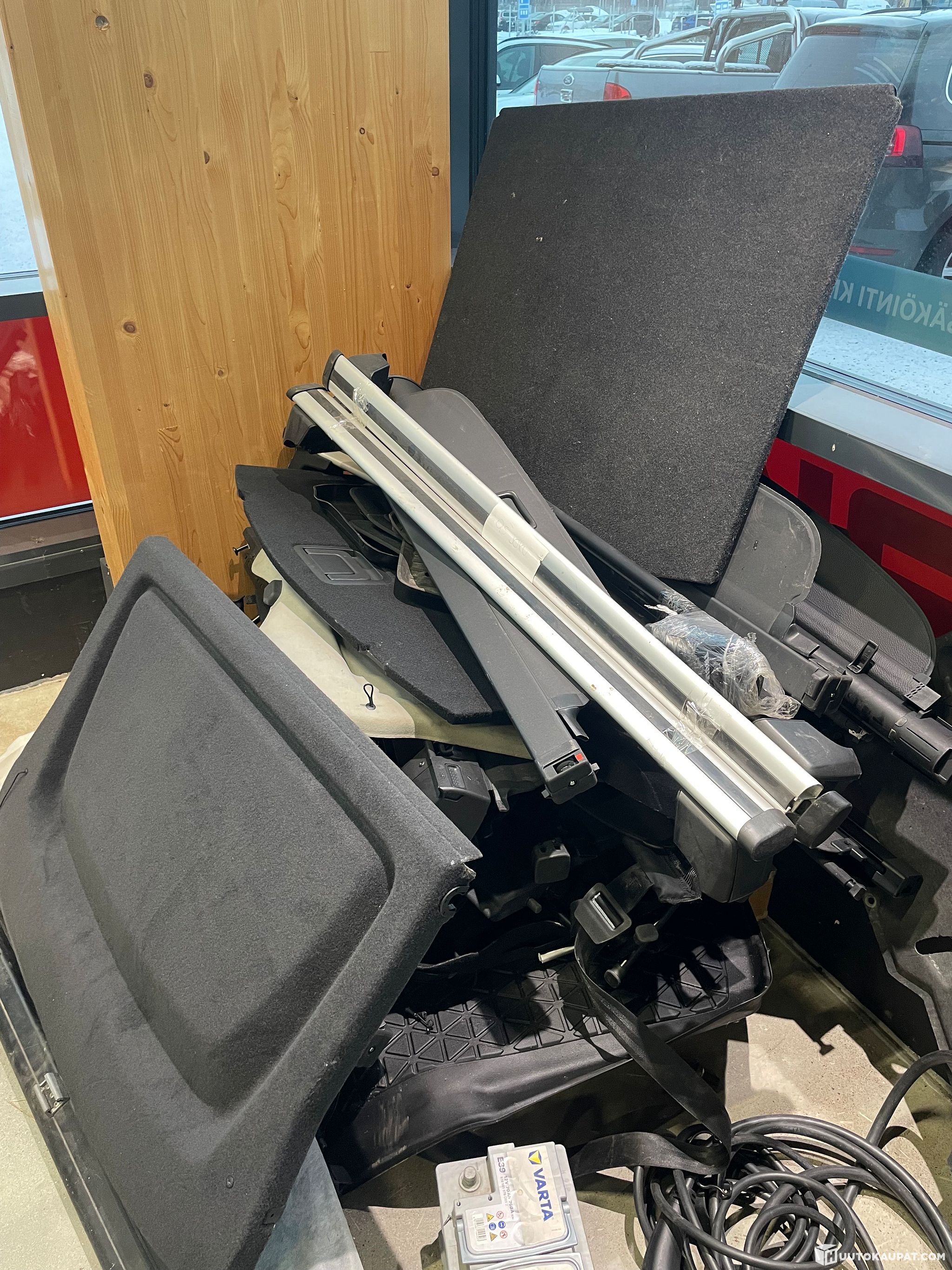 Auton hattuhyllyjä, käytettyjä sekä käyttämättömiä.