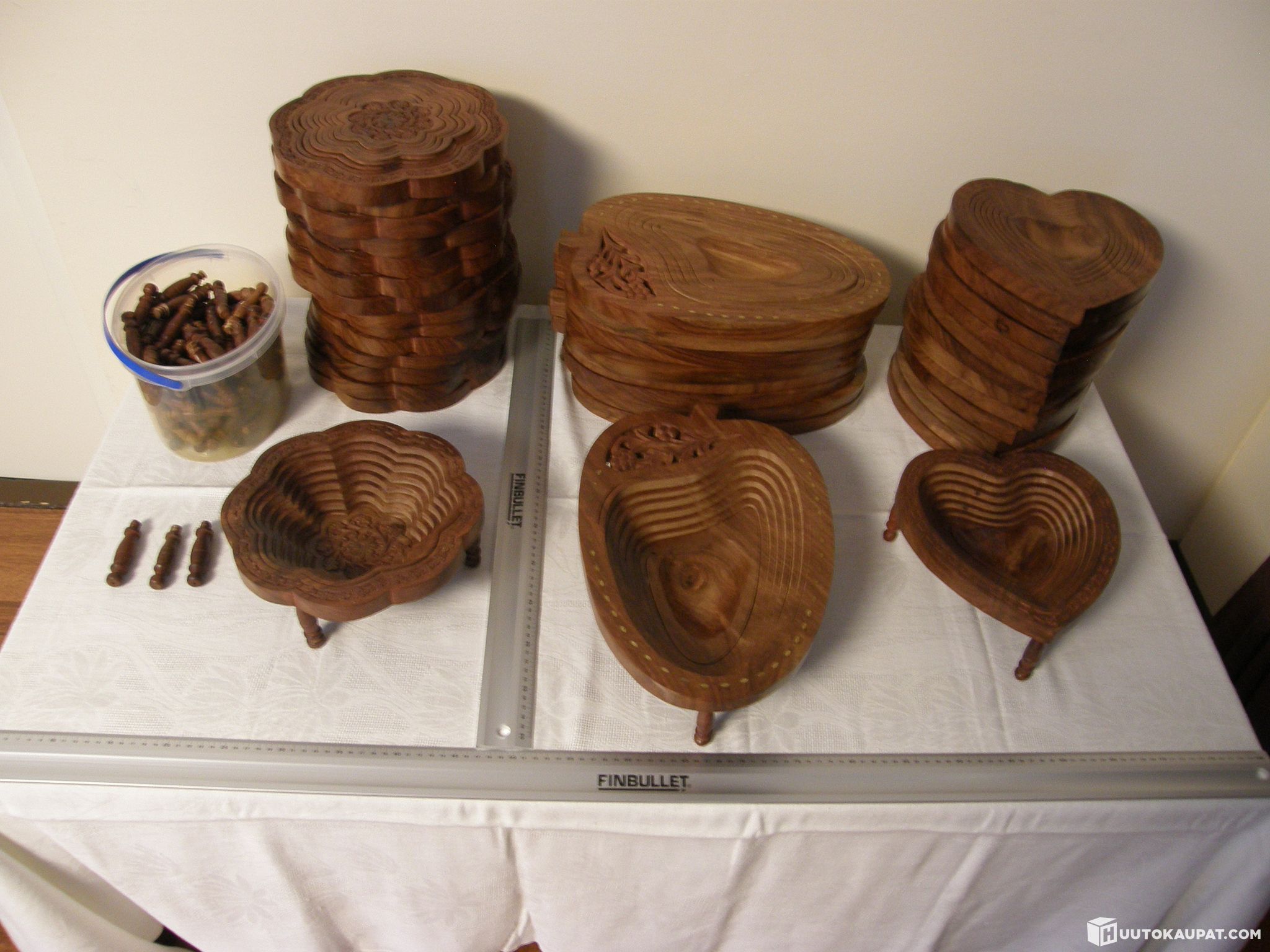 Käsin veistetty puinen kokoontaitettava hedelmä, makeiset, ym kori.