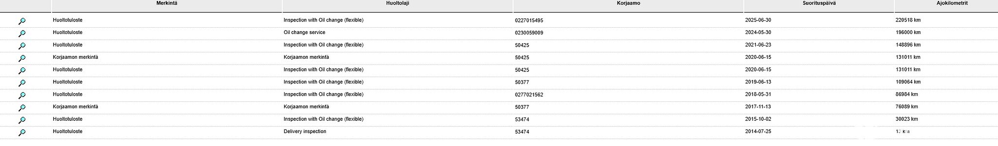 Auto on huollettu 30,76,86,109,131,148,196,220tkm kohdalla!