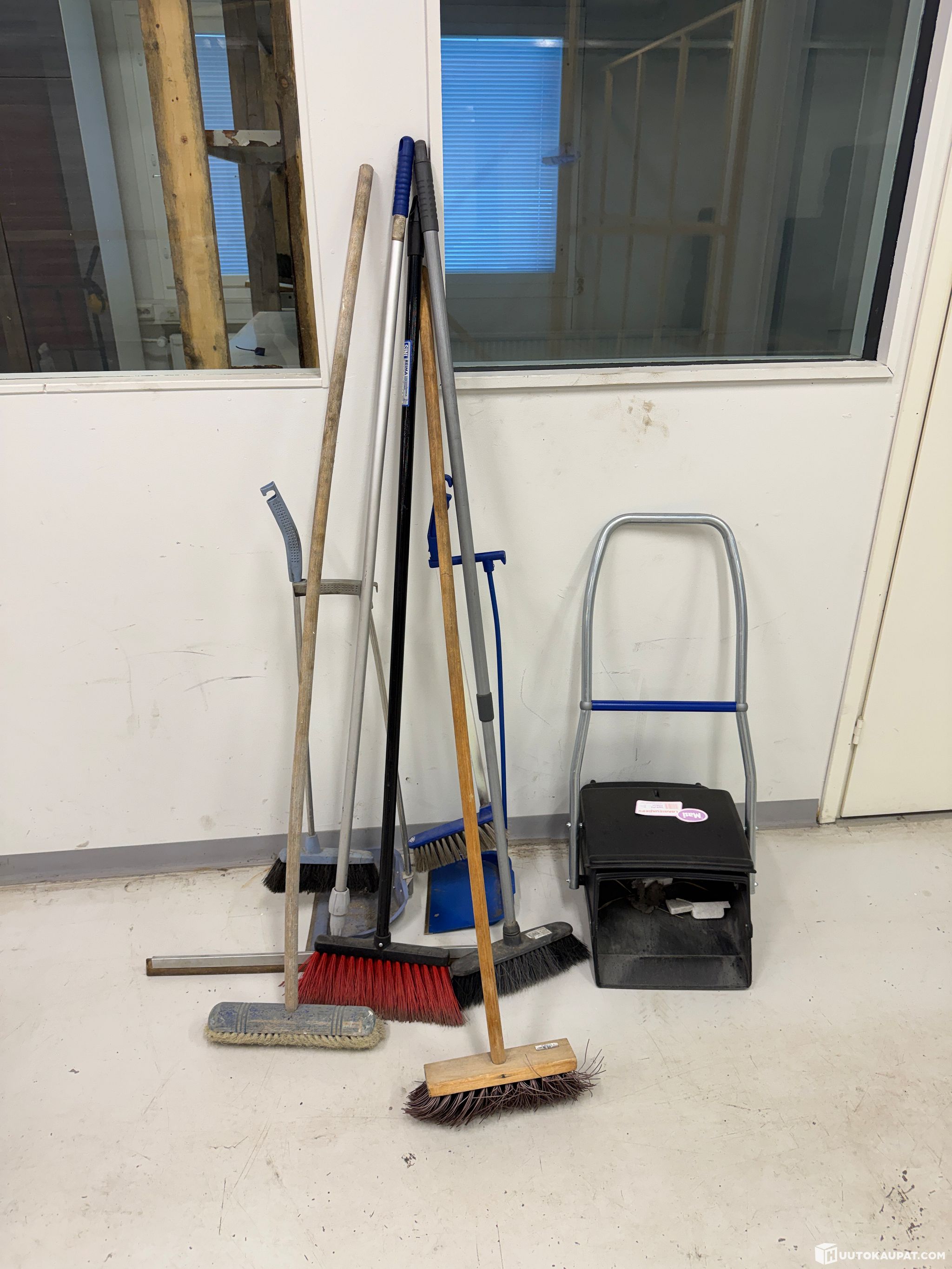 Siivousvälineitä, harjoja, lastoja, rikkalapioita, kihveleitä