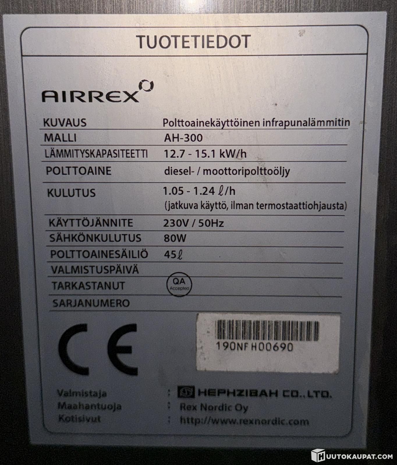 Säteilylämmitin. Katso kuvista tekniset tiedot.
