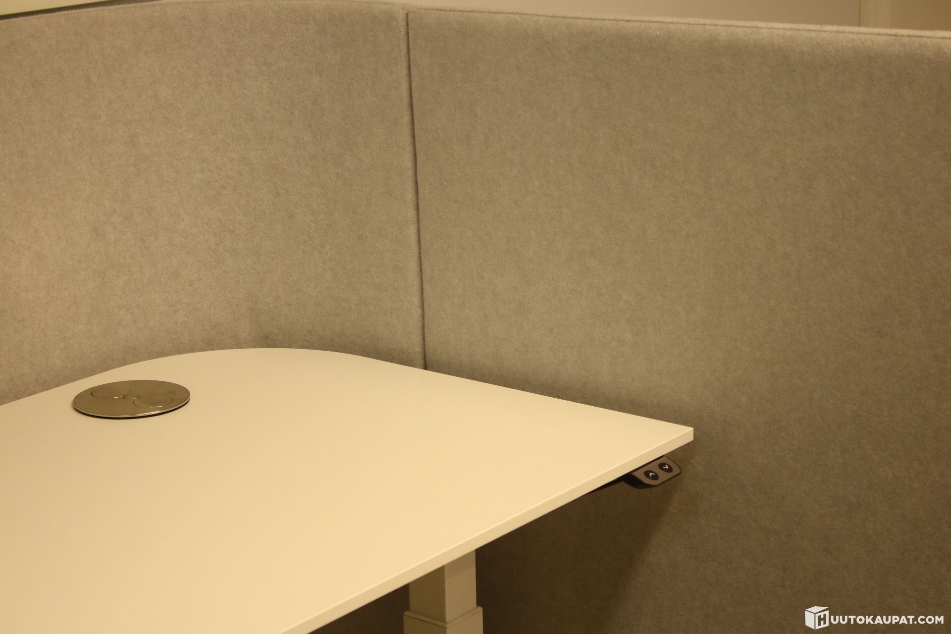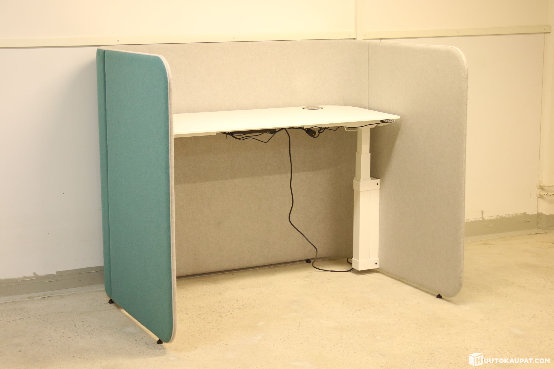Arvokas Martela PodWork-työpiste akustoivilla seinäelementeillä ja sermeihin integroidulla sähköpöydällä. Tällaisia harvoin saatavilla. Kaksimoottorinen sähköpöytä kiinnittetään sermeihin ruuvein. Kannessa kaksi pistorasiapaikkaa.