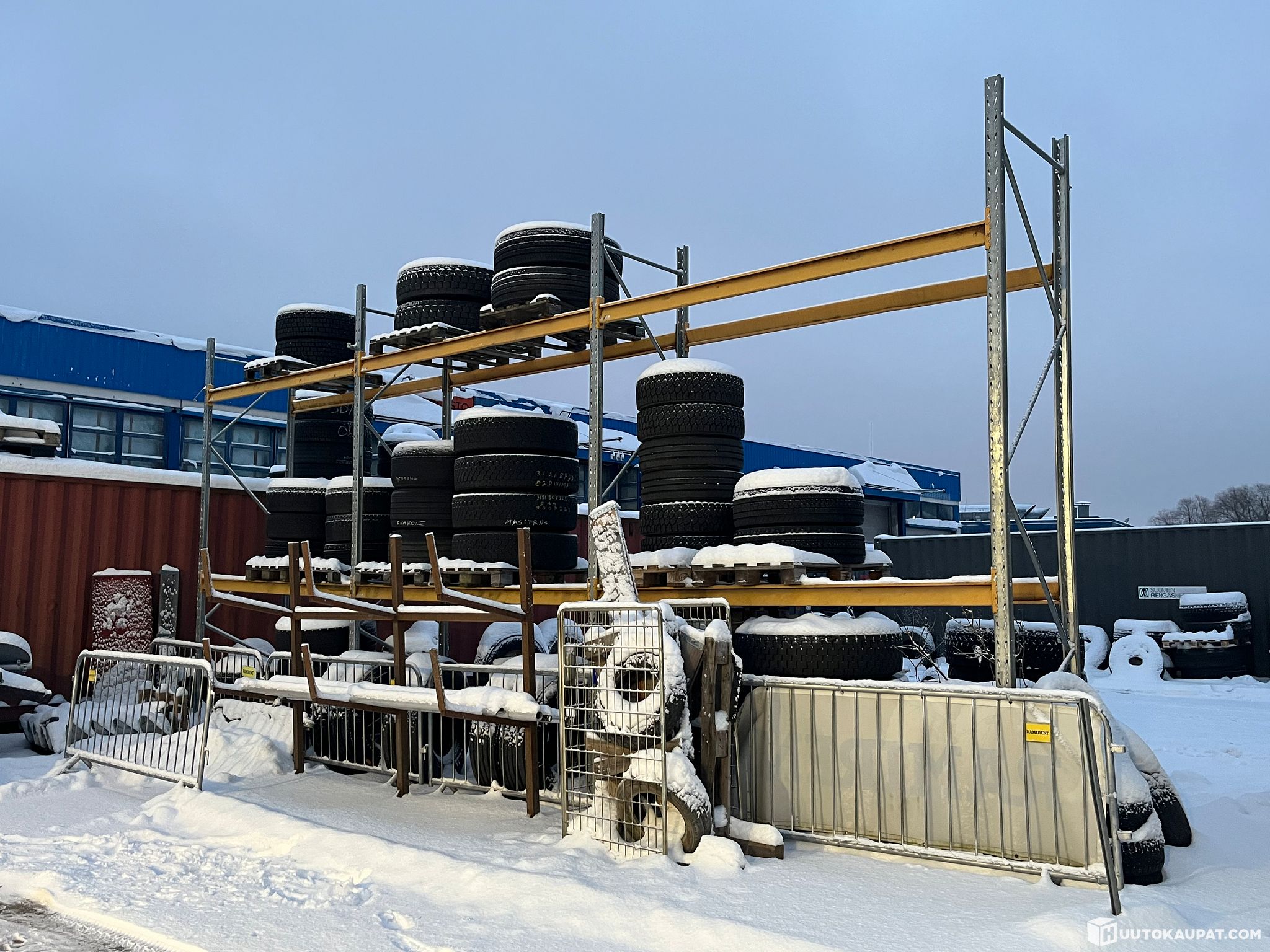 Trukkilavahyllyä joka on kasattuna ulkona.