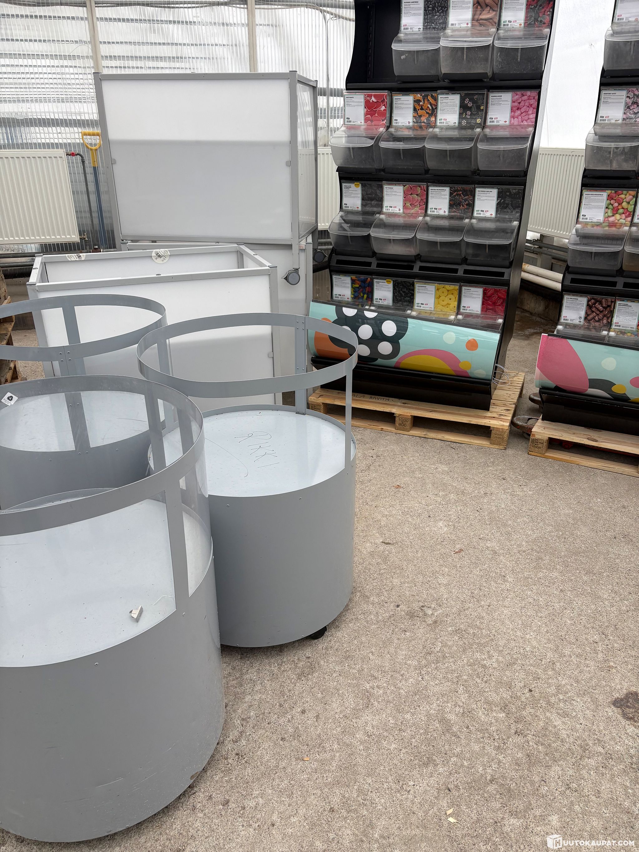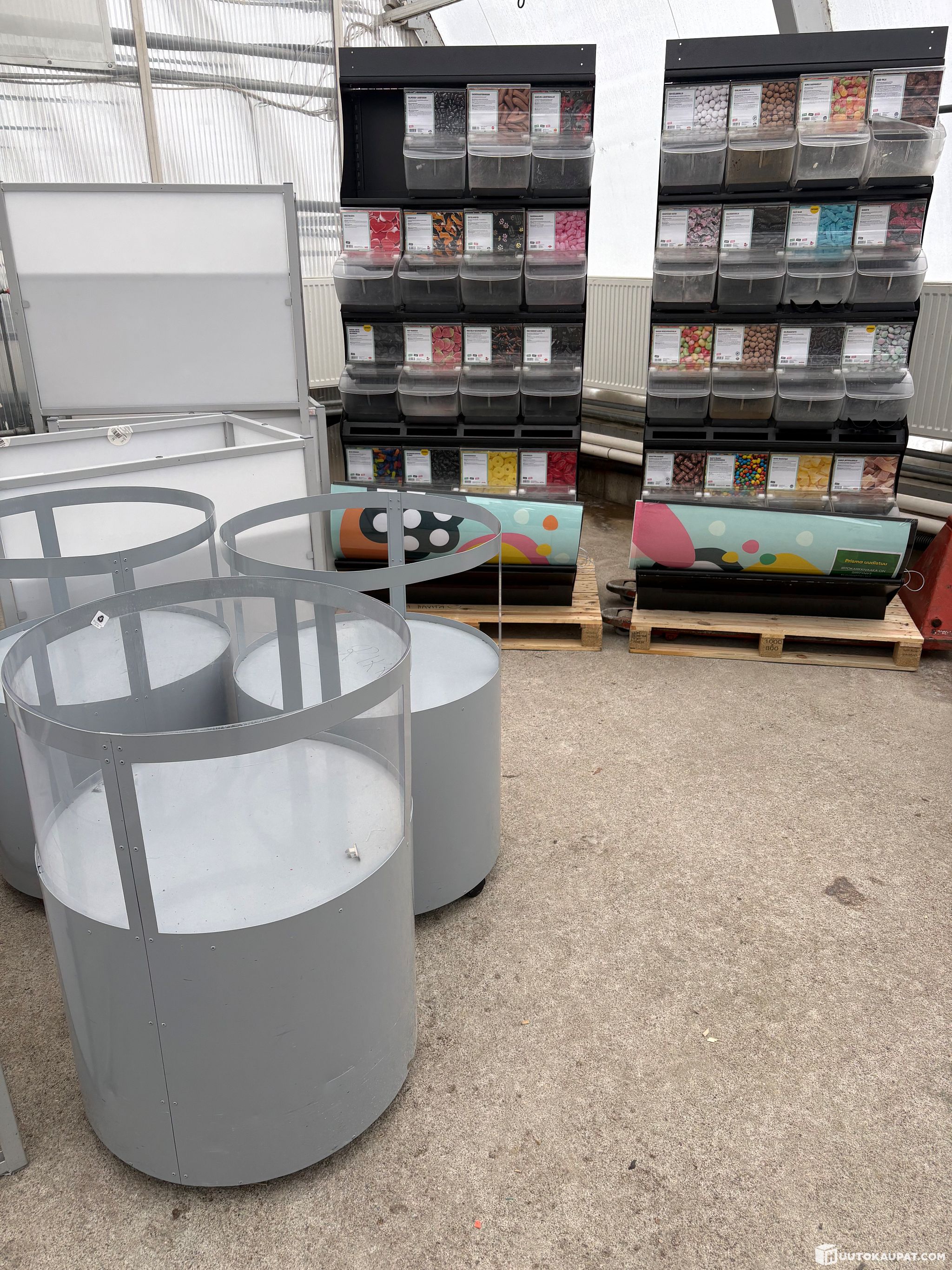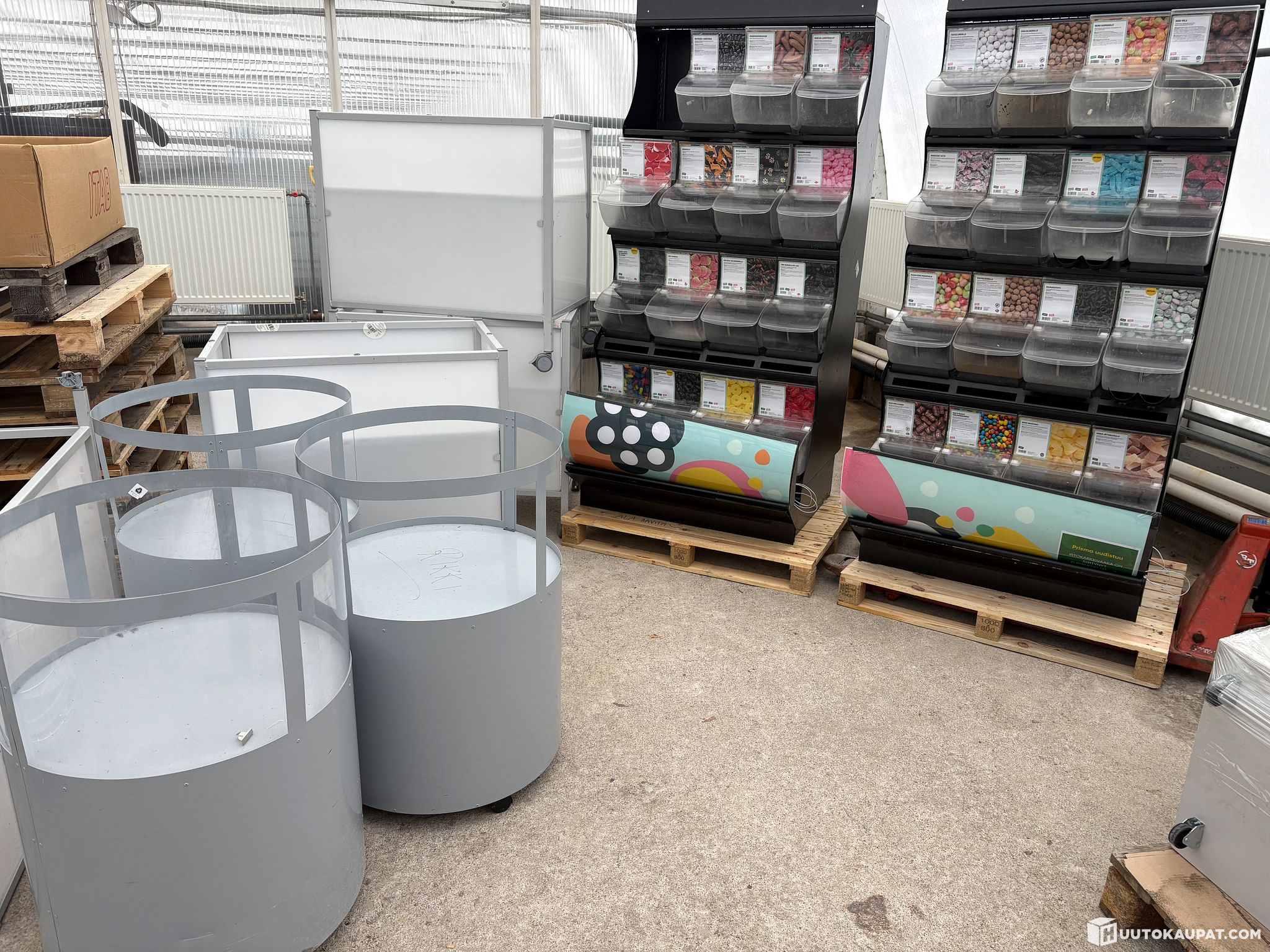 2 kpl irtokarkkihyllykkö, joissa 30 kpl karkkilaatikkoa yhteensä. Päällä irrotettava valolippa.