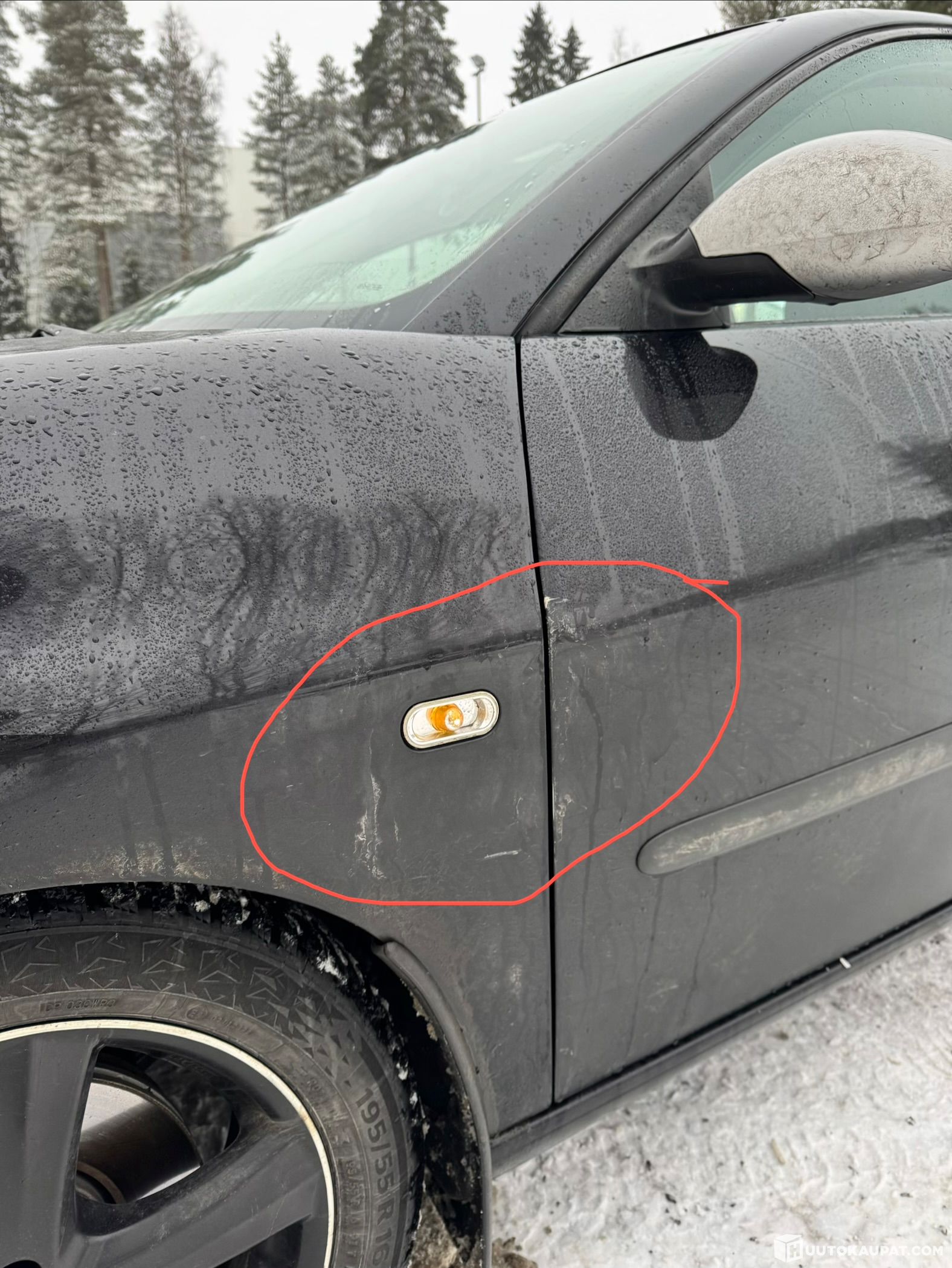 Auton vasemman puolen oven ja etulokarin paneelin saumakohtaan peruutettu parkkipaikalla joulukuussa 2025. Täysin kosmeettinen vaurio, ei vaikuta ajamiseen ollenkaan. Vilkun kupu tippunut samassa. Viimeisessä kuvassa näkyy vauriot, eli ei näy pitkälle.