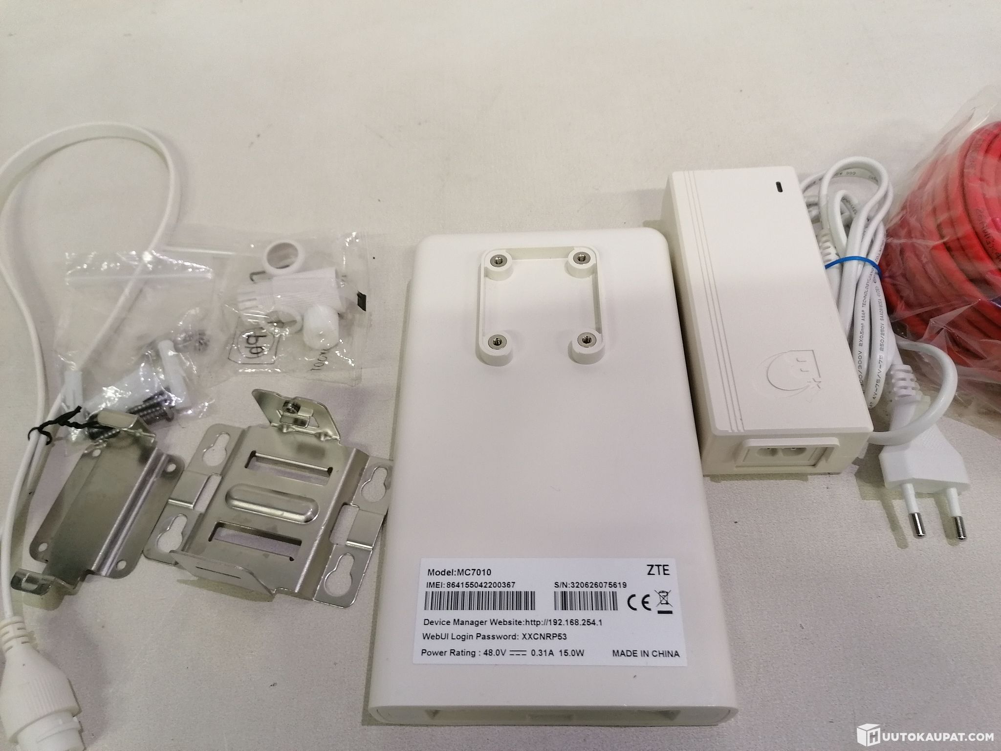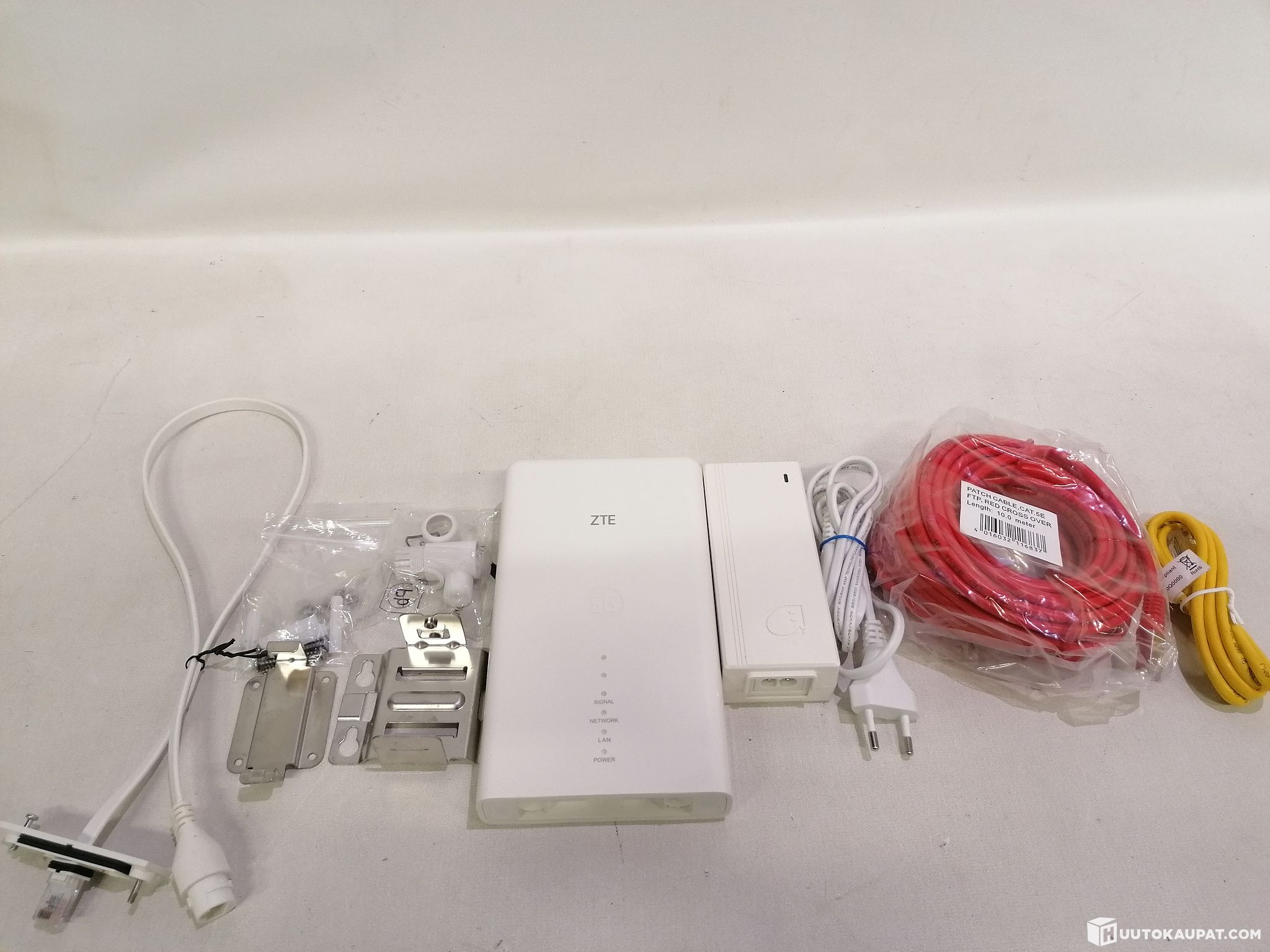 Reitittimen mukana tulee seinäkiinnike, Lattakaapeli - laitteen pohjaan, kiinnitysruuvit, metalliklemmari, pitkä ethernetkaapeli (10metrinen), toinen lyhyt ethernetkaapeli sisälle, tiiviste lattakaapelin ja ethernetin väliin, PoE kytkin, sekä siihen virtapiuha.