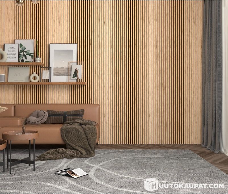 Pohjamateriaalina on huopa, mikä vähentää melu- ja kaikutasoja ja parantaa ääniympäristöä huoneessa. Paneeleiden pintamateriaali on valmistettu puuviiluista, joka luo kodikkaan ja miellyttävän tunnelman sekä parantaa sisustuksen yleistä laatua ja mukavuutta.