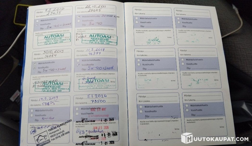 Huoltokirja löytyy, ja auto on juuri huollettu sekä katsastettu.