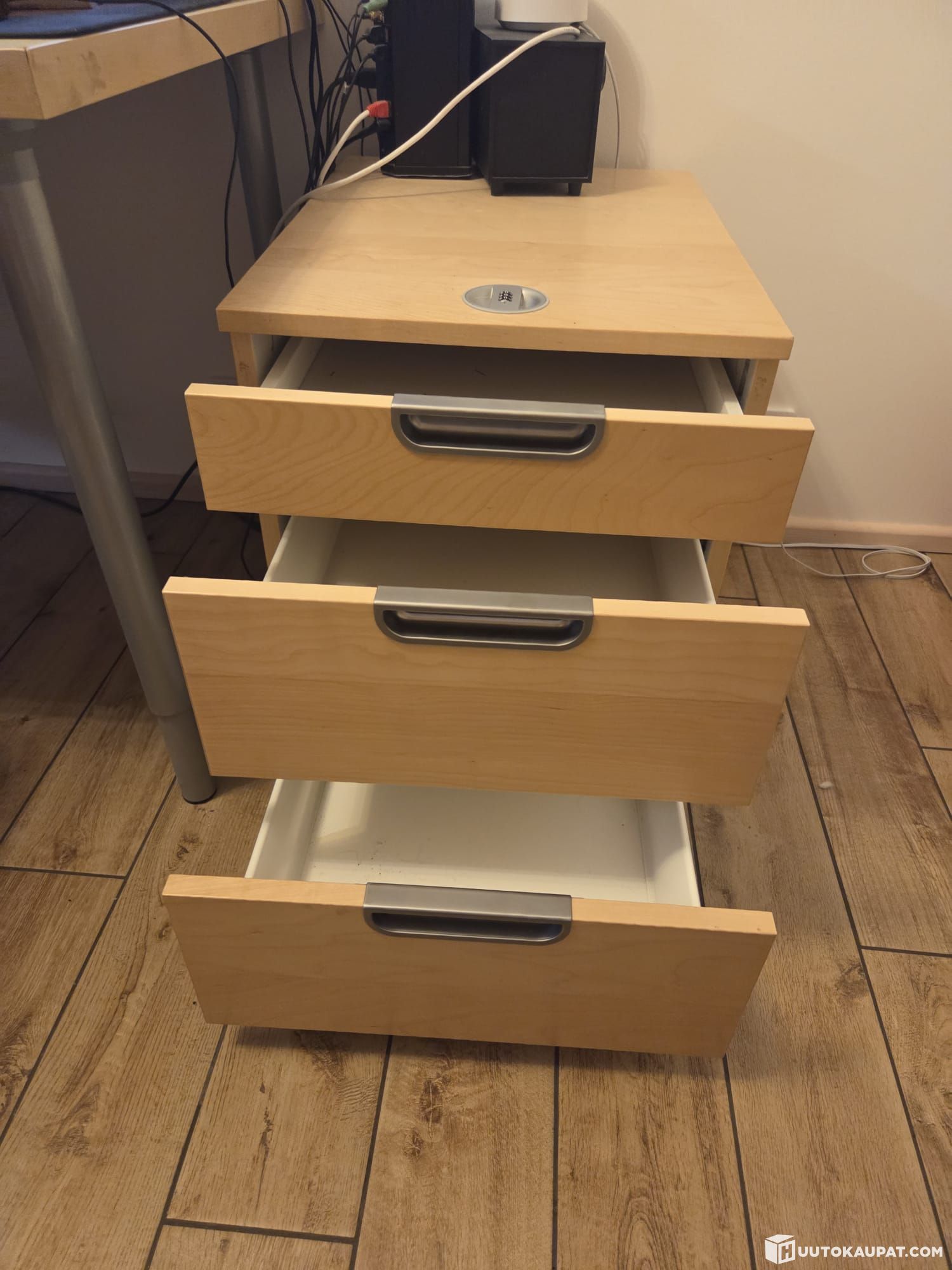 Ikea laatikosto, sopii työpöydän alle. 3 vetolaatikkoa, toimivat hyvin. Kunto hyvää, normaalia käytön jälkeä.
