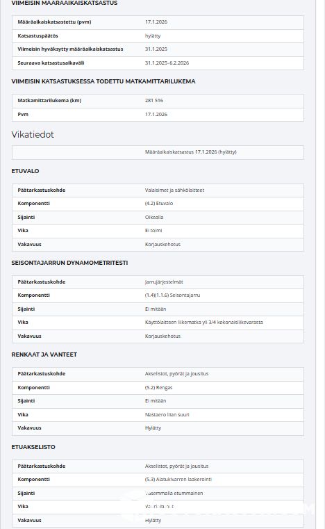 Huom. Käytetty katsastuksessa, kts kuva vikalistasta (viimeinen kuva). Hylätty: Alatukivarren laakerointi sekä nastaero liian suuri.