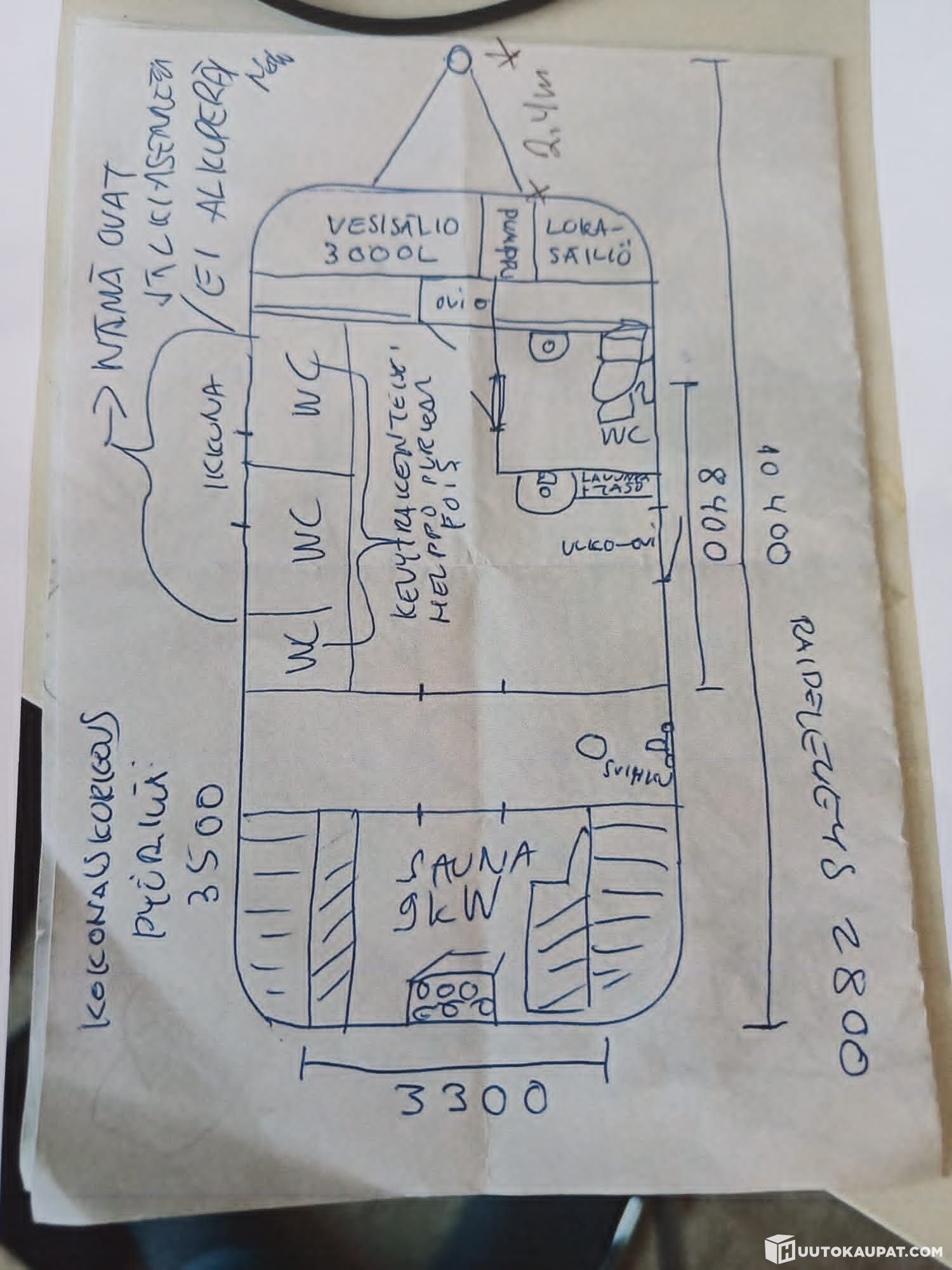 Päädyssä sauna, kahdet lauteet (noin 6hlö mahtuu). Sen jälkeen suihkutila. Isoimmassa tilassa ulko-ovi, 3kpl vessoja. Nämä on jälkikäteen asennettu ja helposti purettavissa. Tähän kun jättää yhden vessan niin saa vaikka pienen kesämökin. Toisessa päädyssä 3000L vesisäiliö ja lokasäiliö. Alle tehty vankka teräsrunko. Vedettävissä esim. kuorma-autolla tai traktorilla ja voi myös nostaa nosturiautolla.