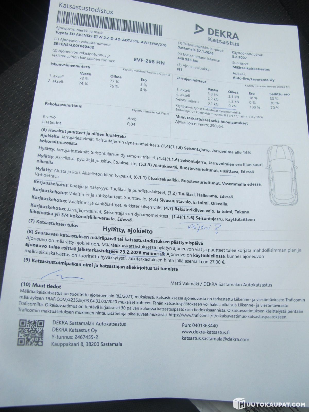 ajokiellossa vikalistan takia.katso lista.käsijarru vaijeri meni katsastuksessa poikki.