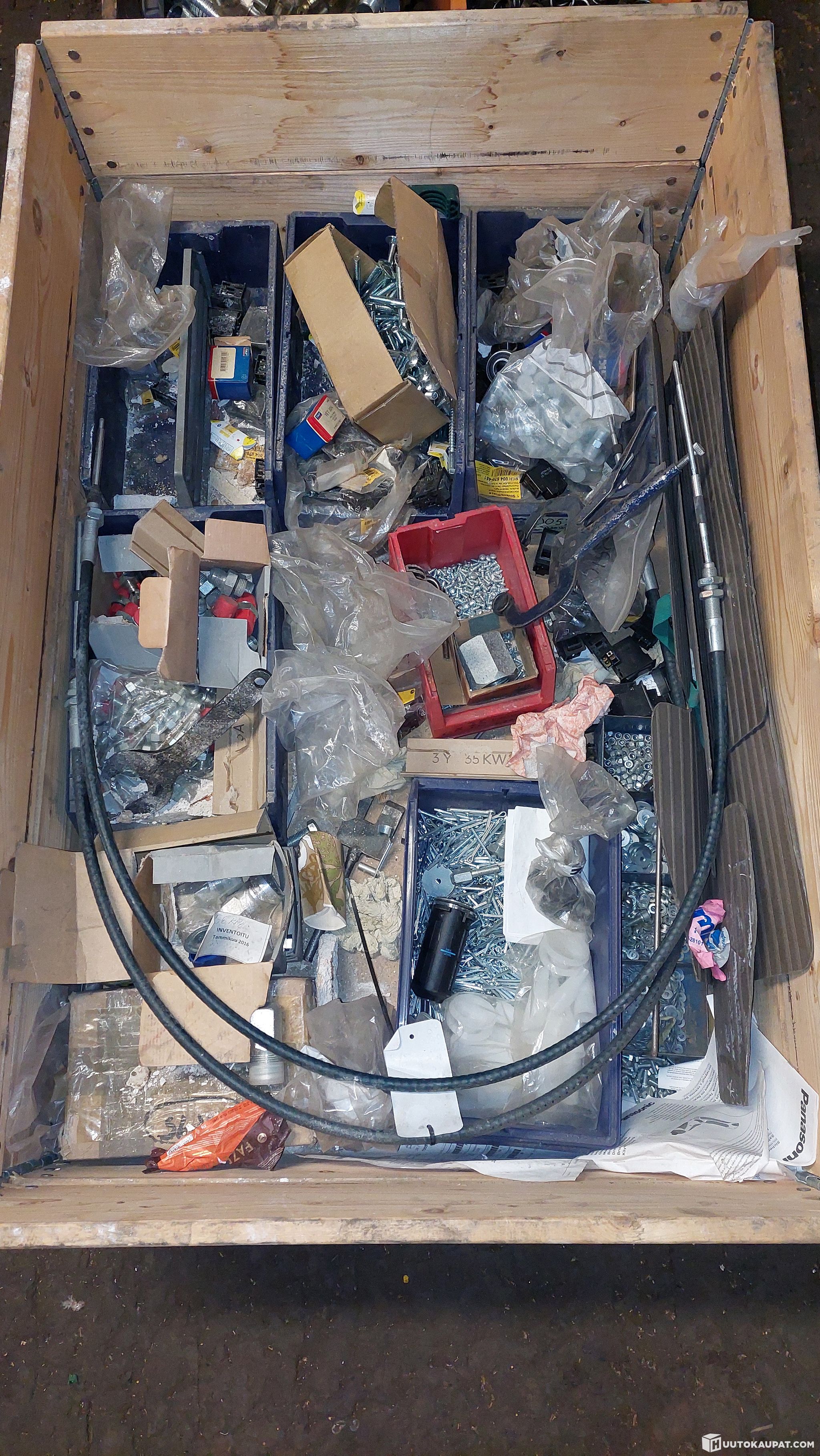 Liittimiä, kiinnitystarvikkeita, vaijereita ja laakereita yms