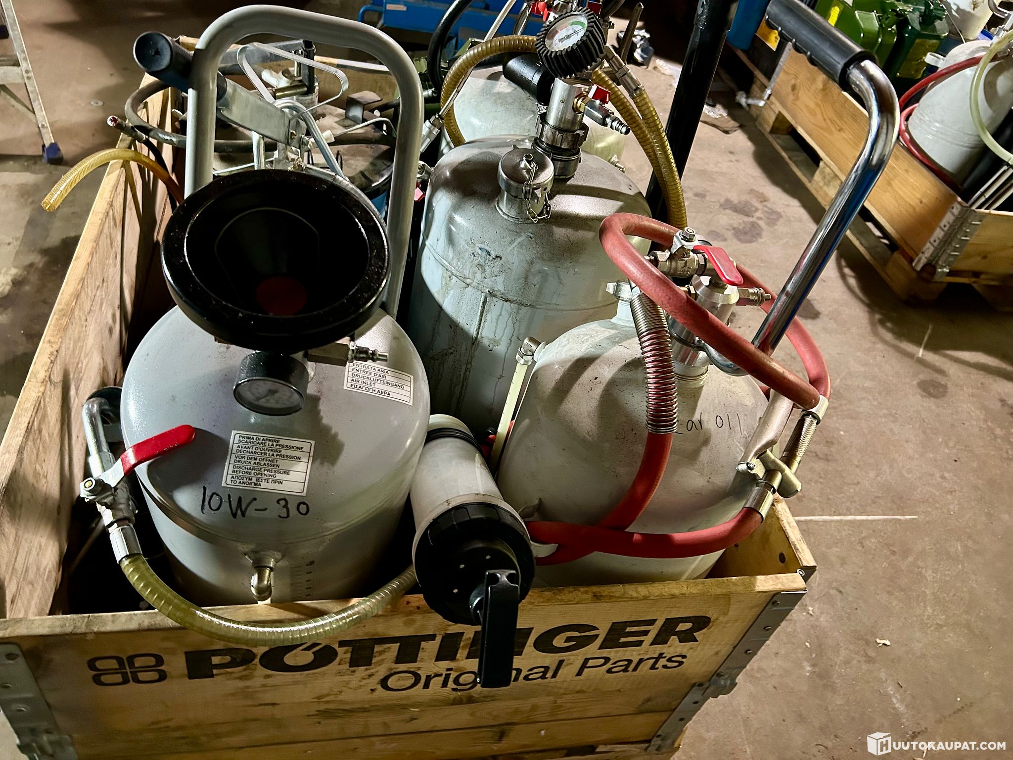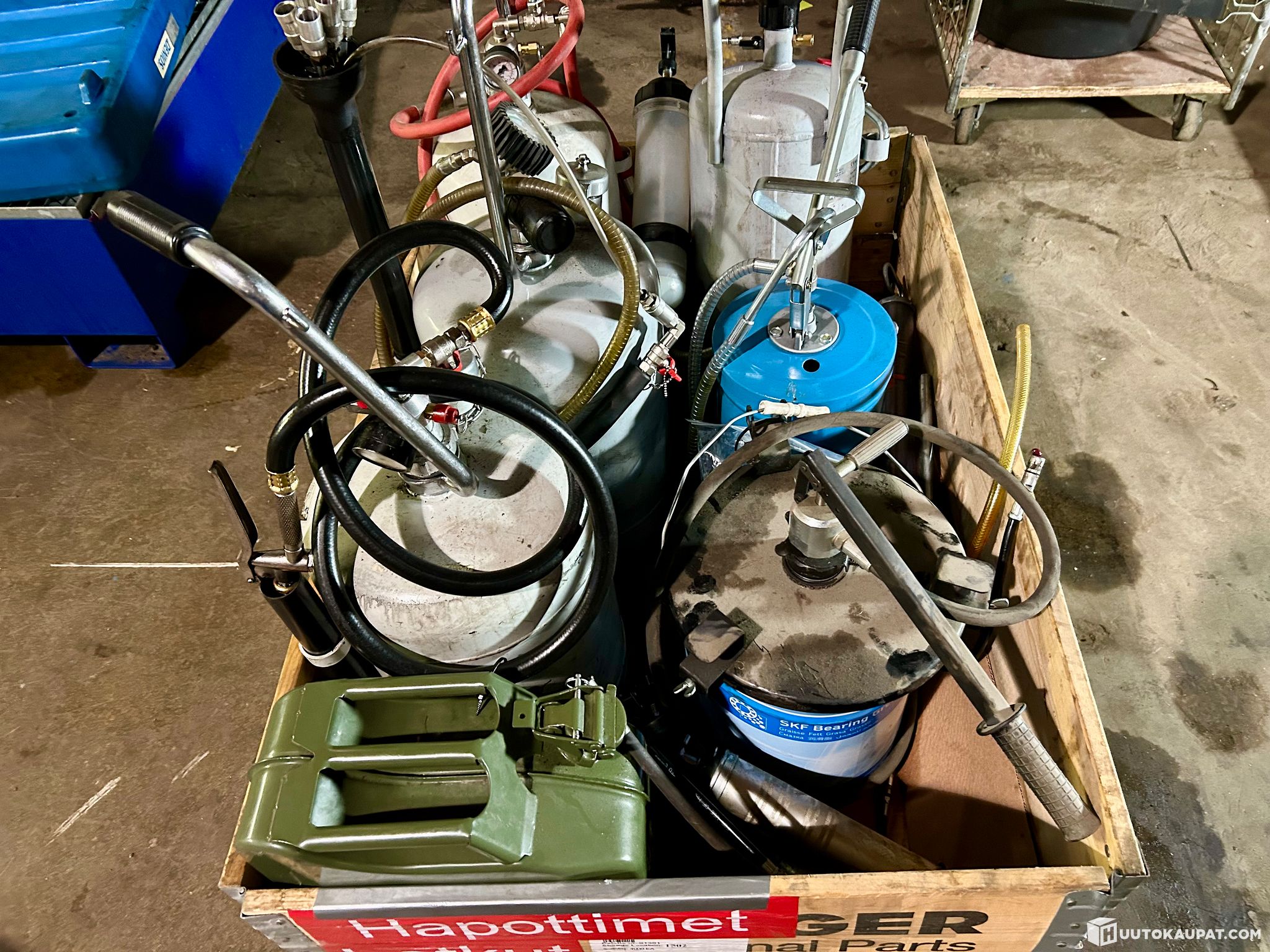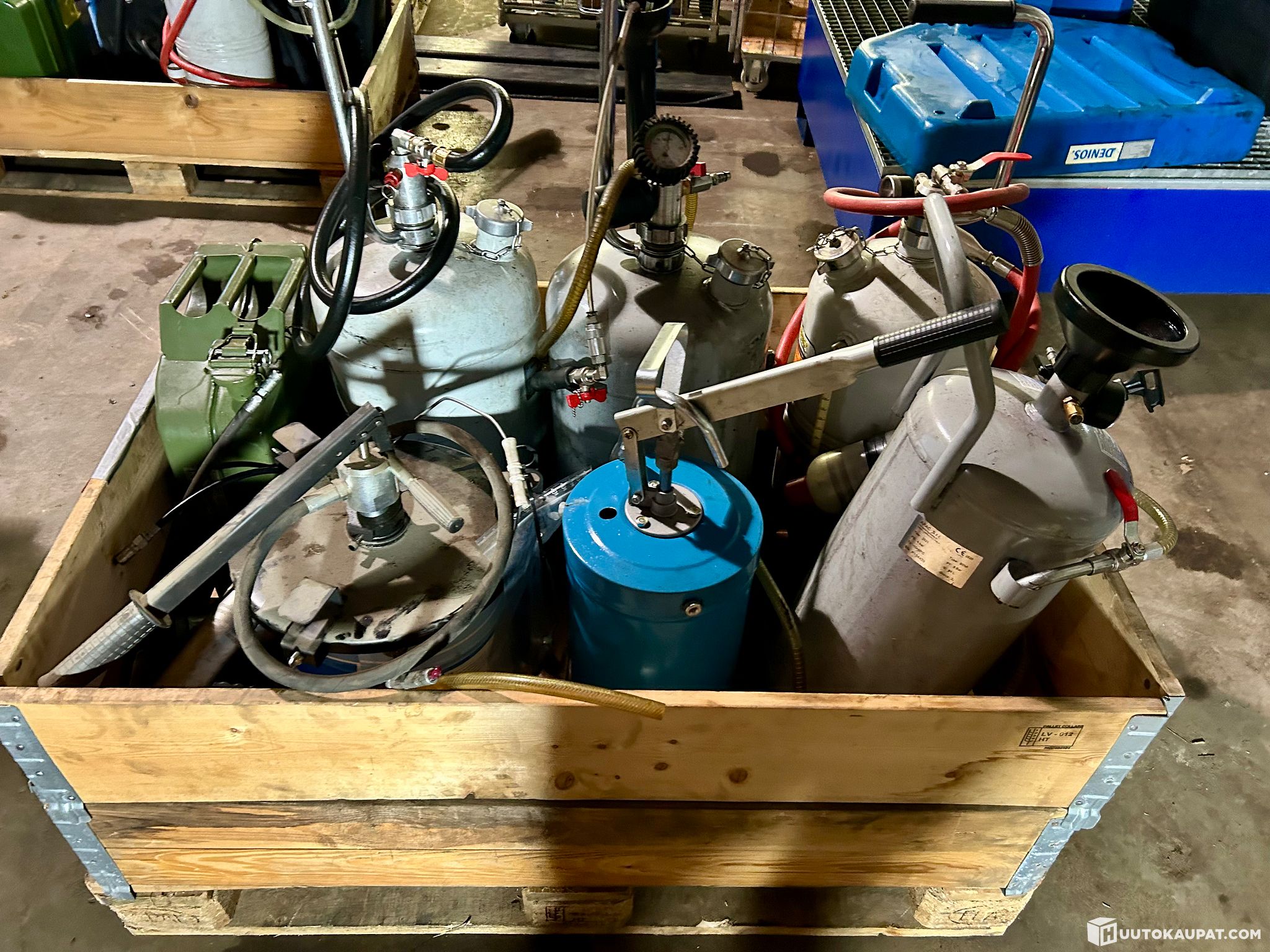 Paineastiat ja pumput: useita harmaita paineastioita, joissa on integroidut käsipumput, painemittarit ja annosteluletkut.