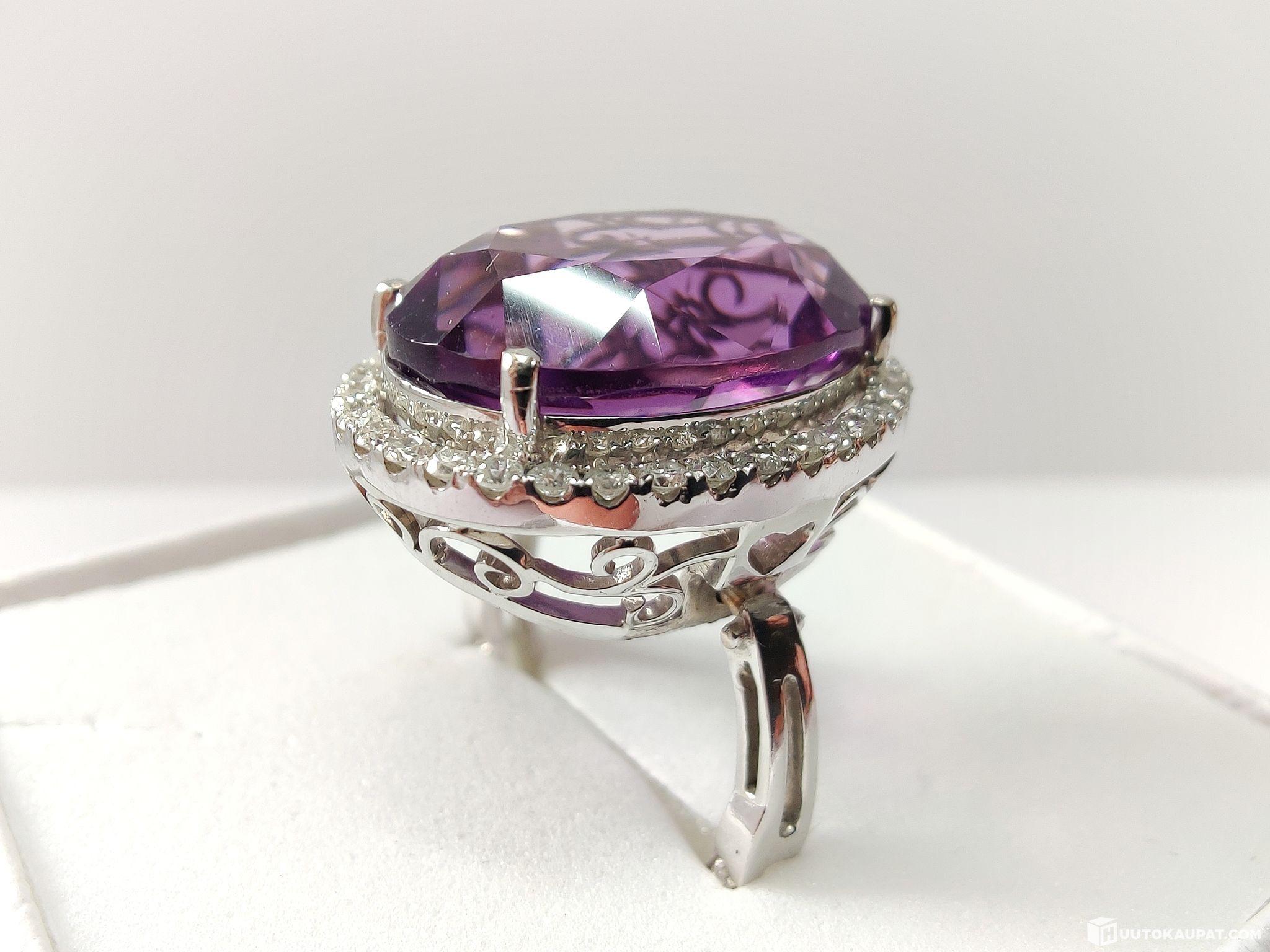 Hurmaavan kaunis ja näyttävä timantein koristeltu ametistisormus/-riipus 750 18k valkokultaa.