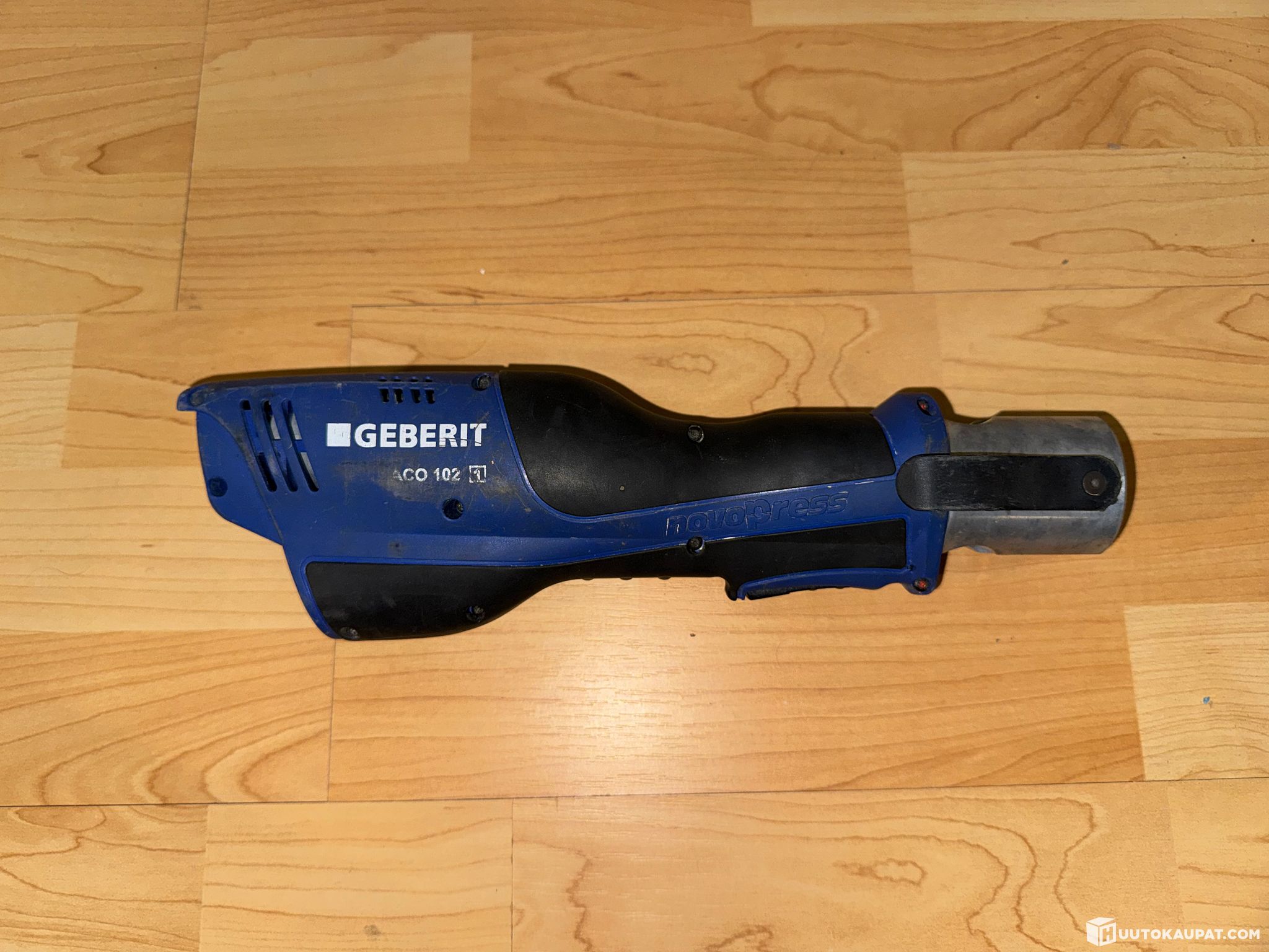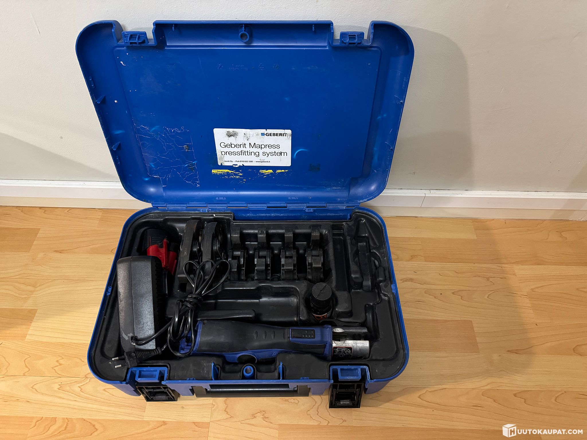 Geberit (NovoPress) Aco 102 puristuskone ja kaikki kuvassa olevat puristusleuat ja tarvikkeet.