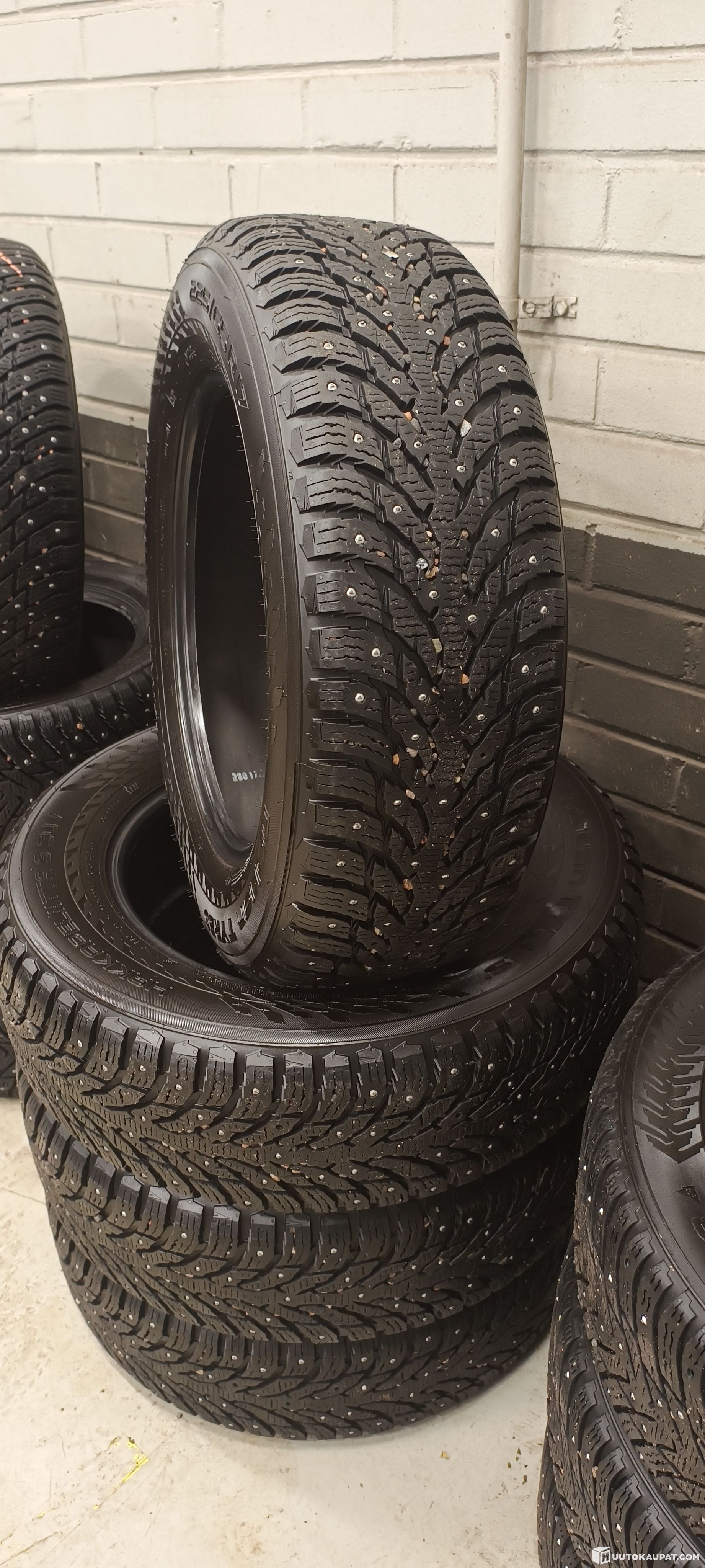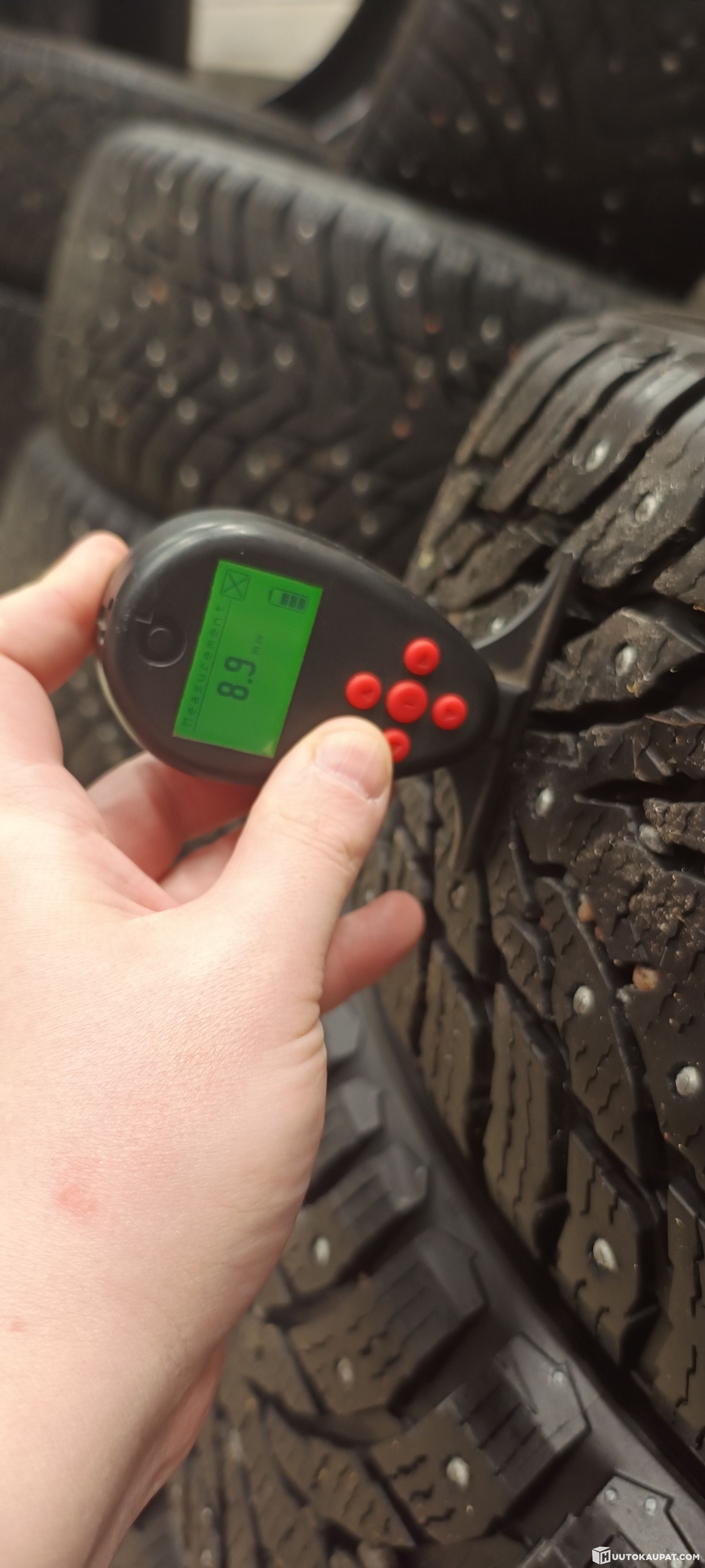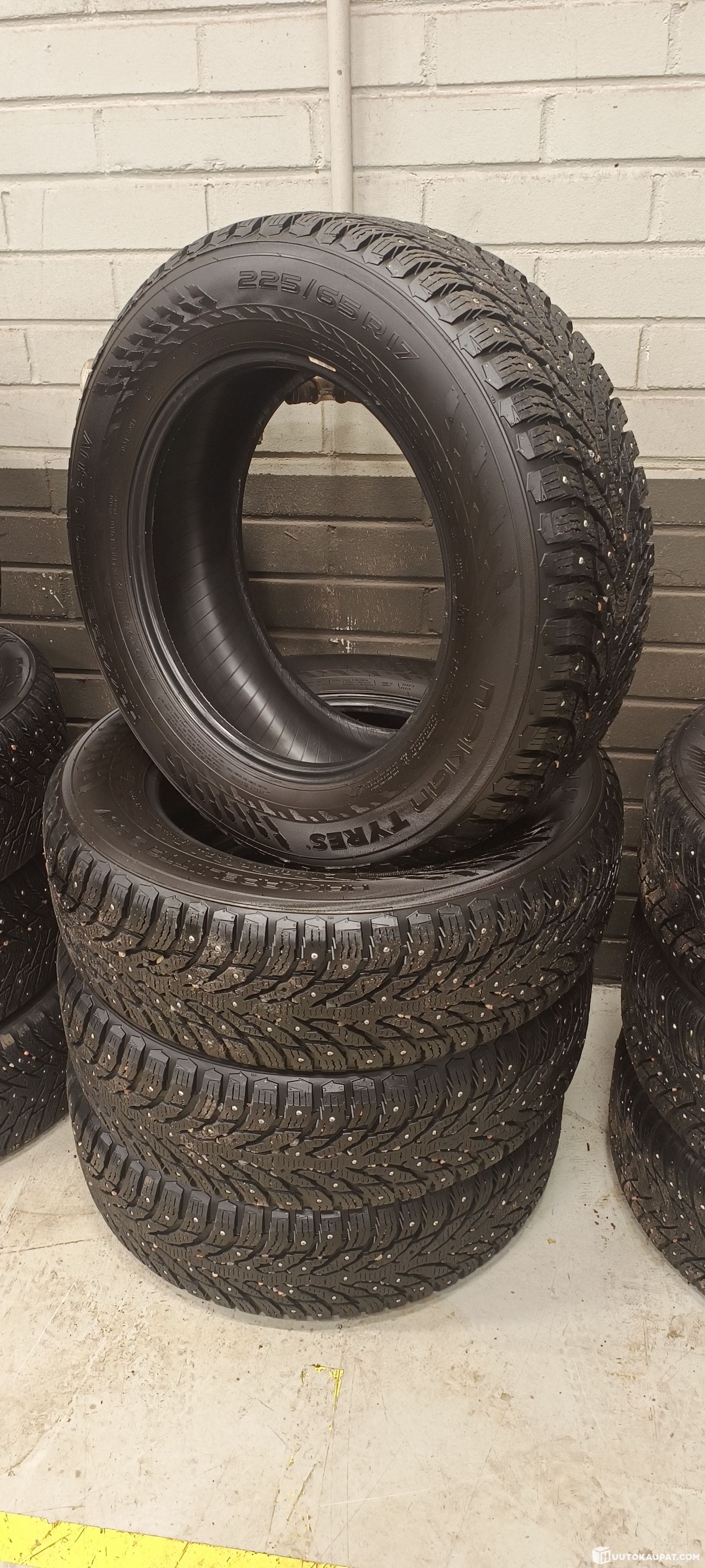 Myynnissä kuvien rengassarja (4kpl). Käytetty sarja. Pintaa reilusti, 8.9mm - 8.0mm. Joitain nastoja irtoillut.