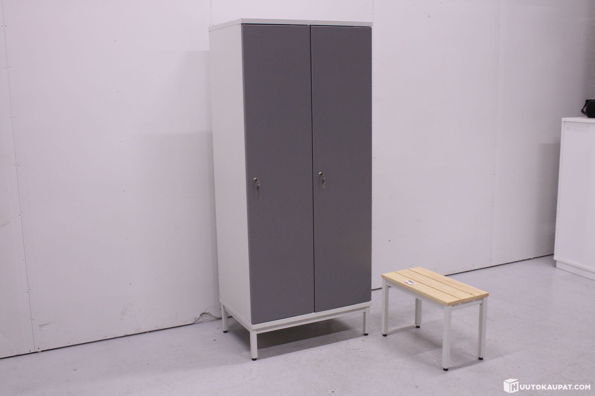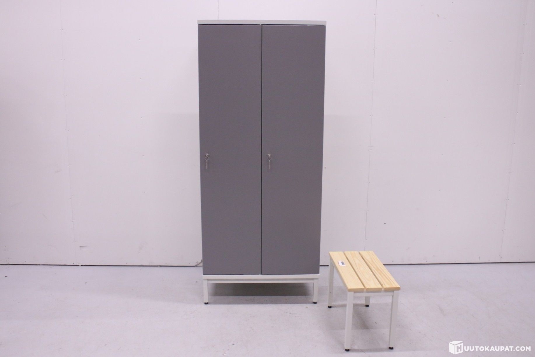 Laadukas Puntan pukukaappi ja penkki. Kaappi erittäin hyvässä kunnossa ja avaimia löytyy molempiin oviin kaksi kappaletta. Mukana myös masterkey.