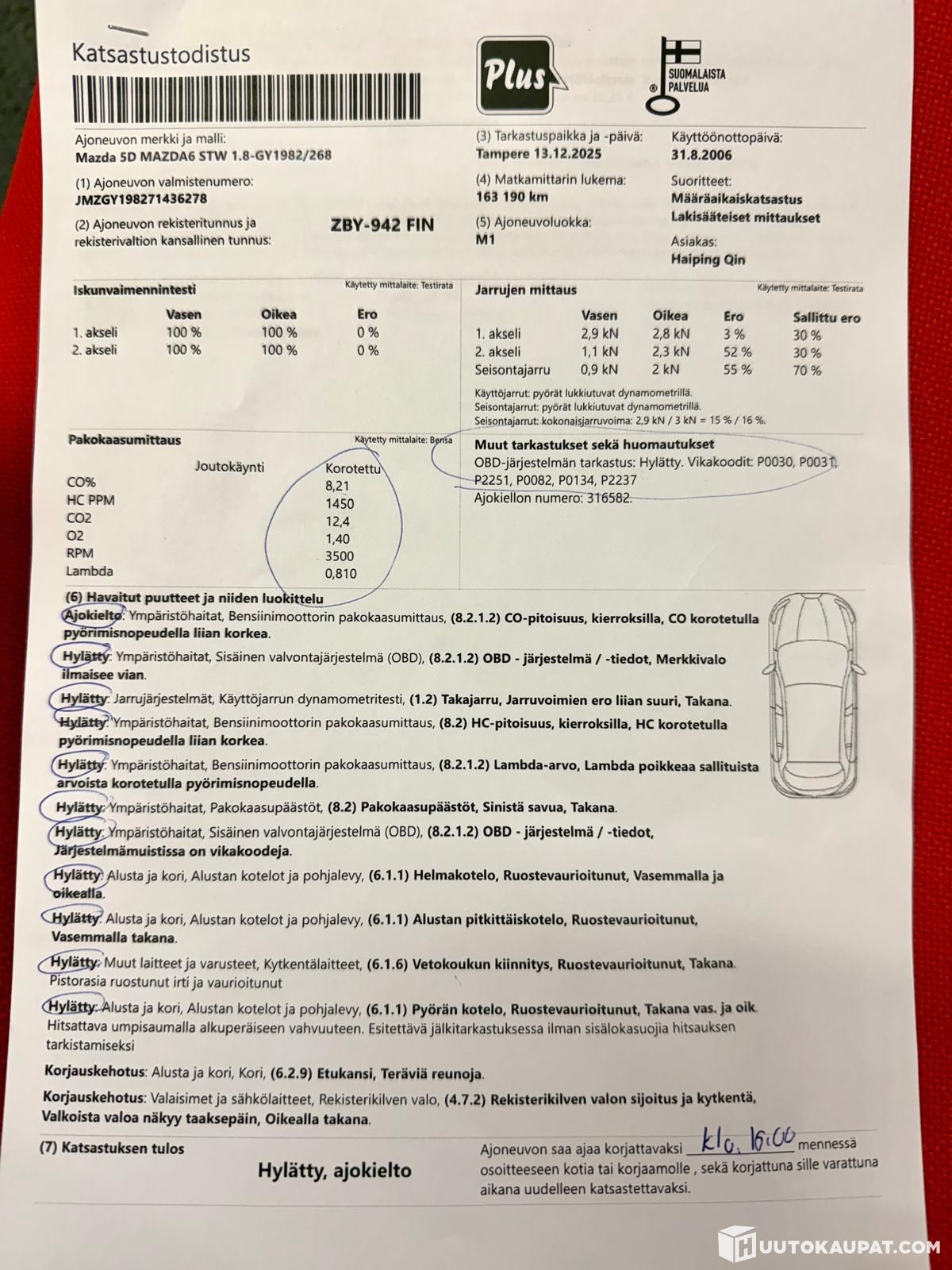 Auto ei läpäissyt katsastusta (Hylätty) ja on tällä hetkellä ajokiellossa. Auto käynnistyy ja liikkuu, ja sillä saa ajaa ainoastaan korjaamolle tai jälkitarkastukseen. Katso kuvat