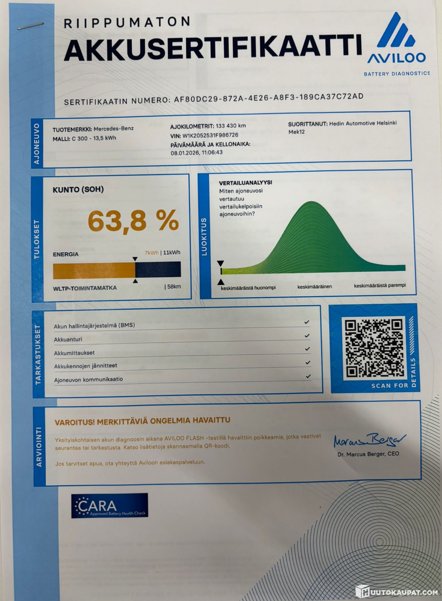Auto ei ole ollut toimestamme teknisessä kuntotarkastuksessa eikä kaikkien varusteiden toimivuutta ole testattu. Siinä saattaa olla piileviä vikoja, joita koeajolla emme havainneet. Autoon on mahdollista tulla tutustumaan tarkemmin ennen sitovan huudon tekemistä. Sovithan tulostasi etukäteen, kiitos.