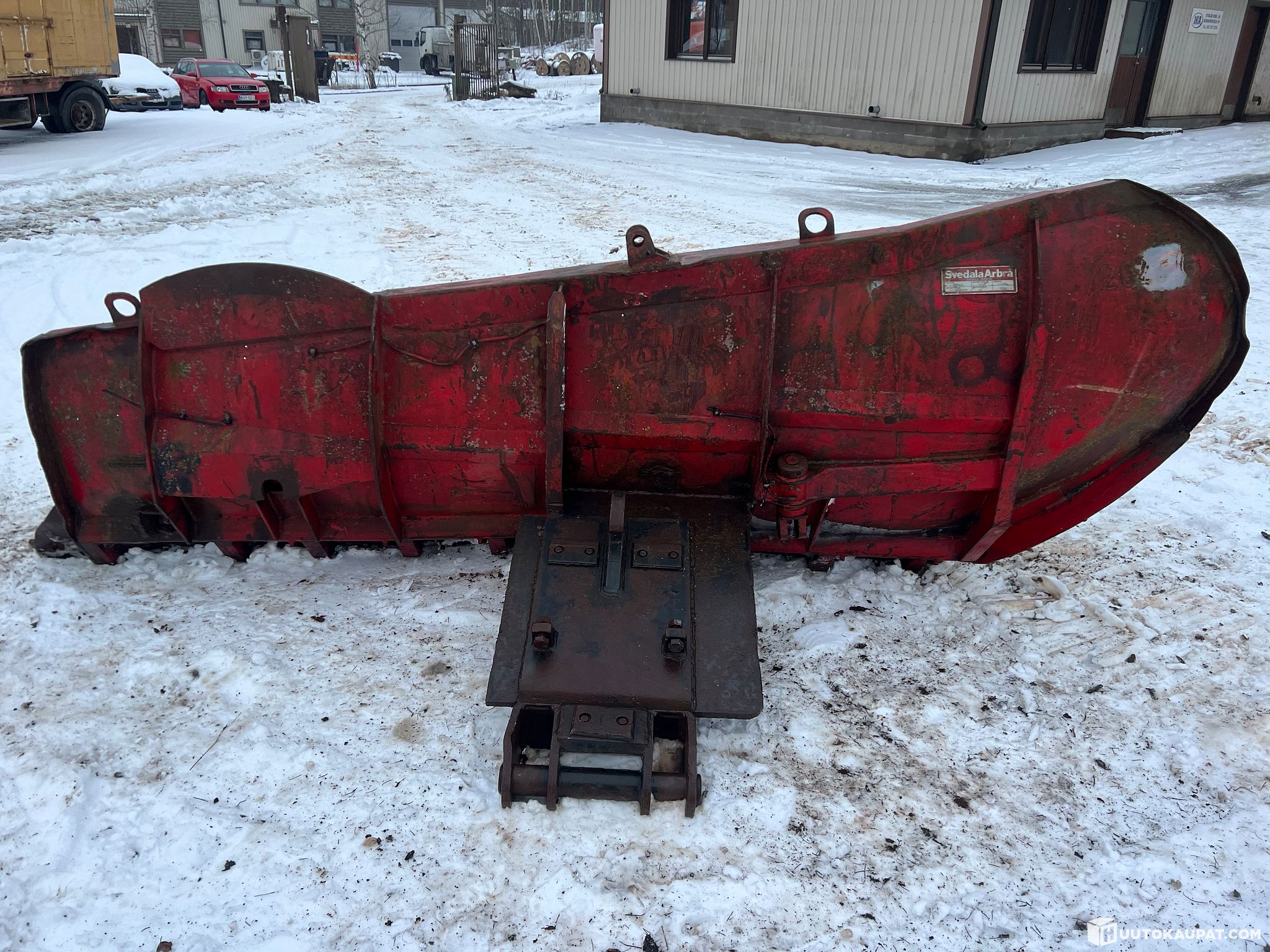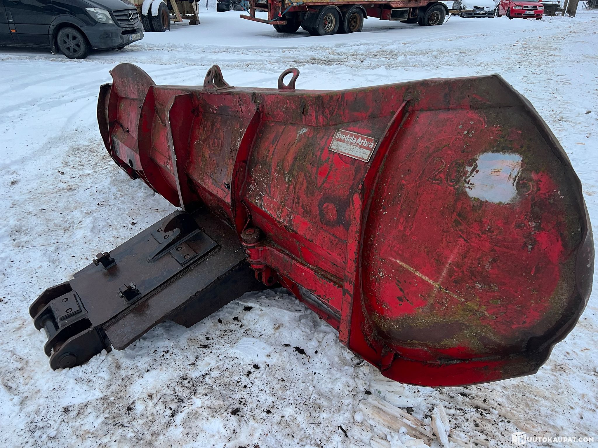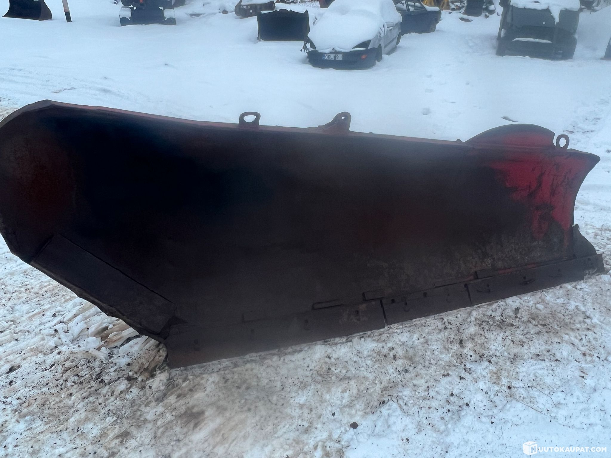 Hyvä lumen puskulevy lumipenkkojen levitykseen, ollut pyöräalustaisessa kaivurissa.