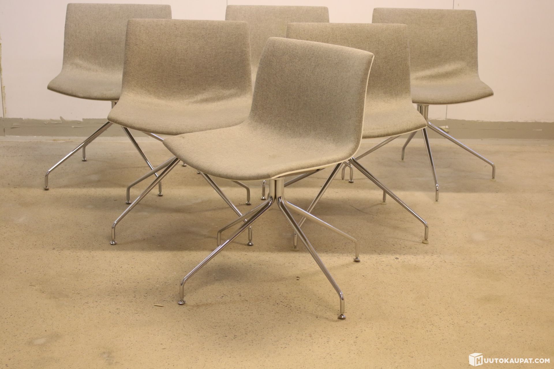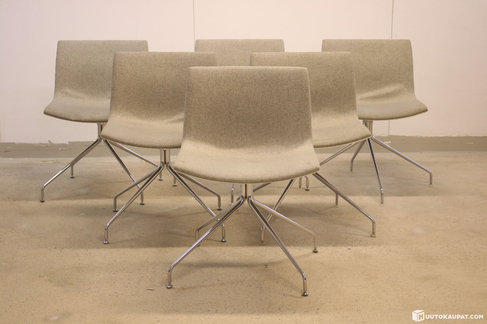 Kuusi kappaletta arvokkaita Arper Catifa-tuoleja. Pyörivä krominen jalusta.
