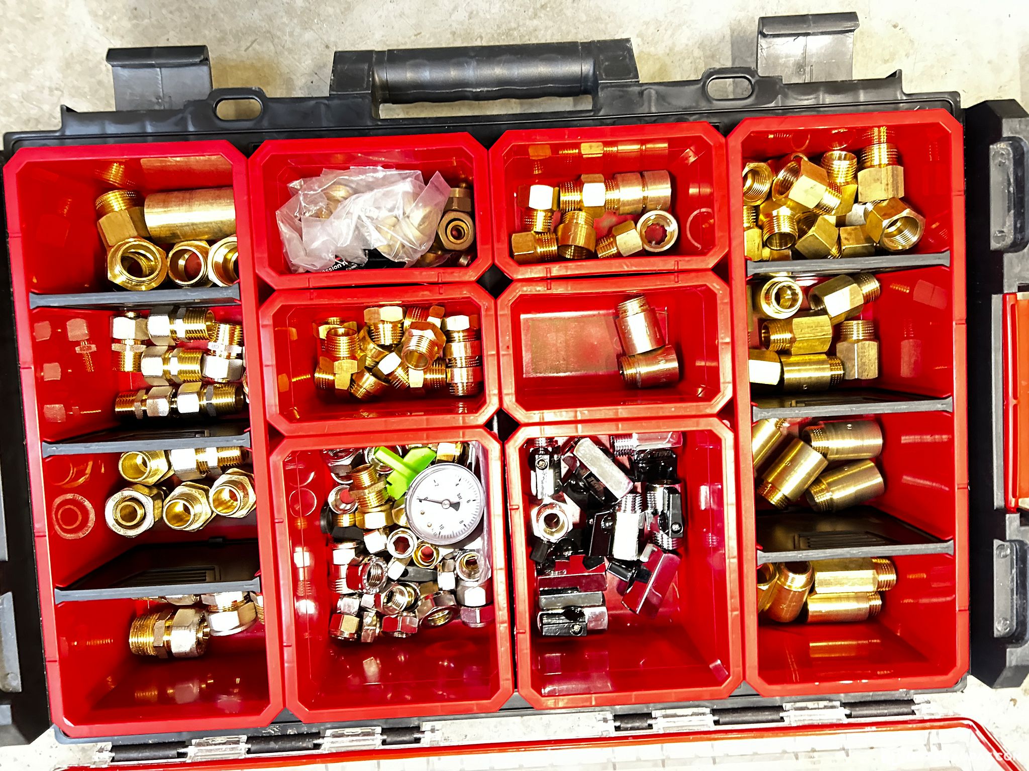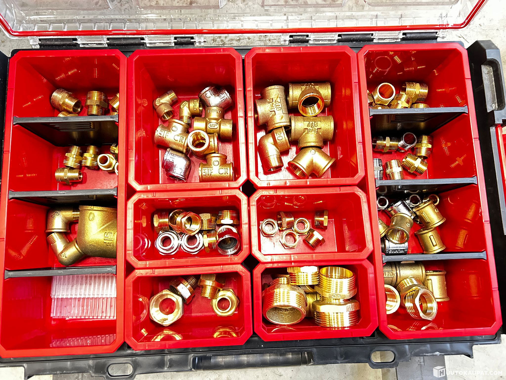 Putkiliittimiä erikokoisia laatikoissa