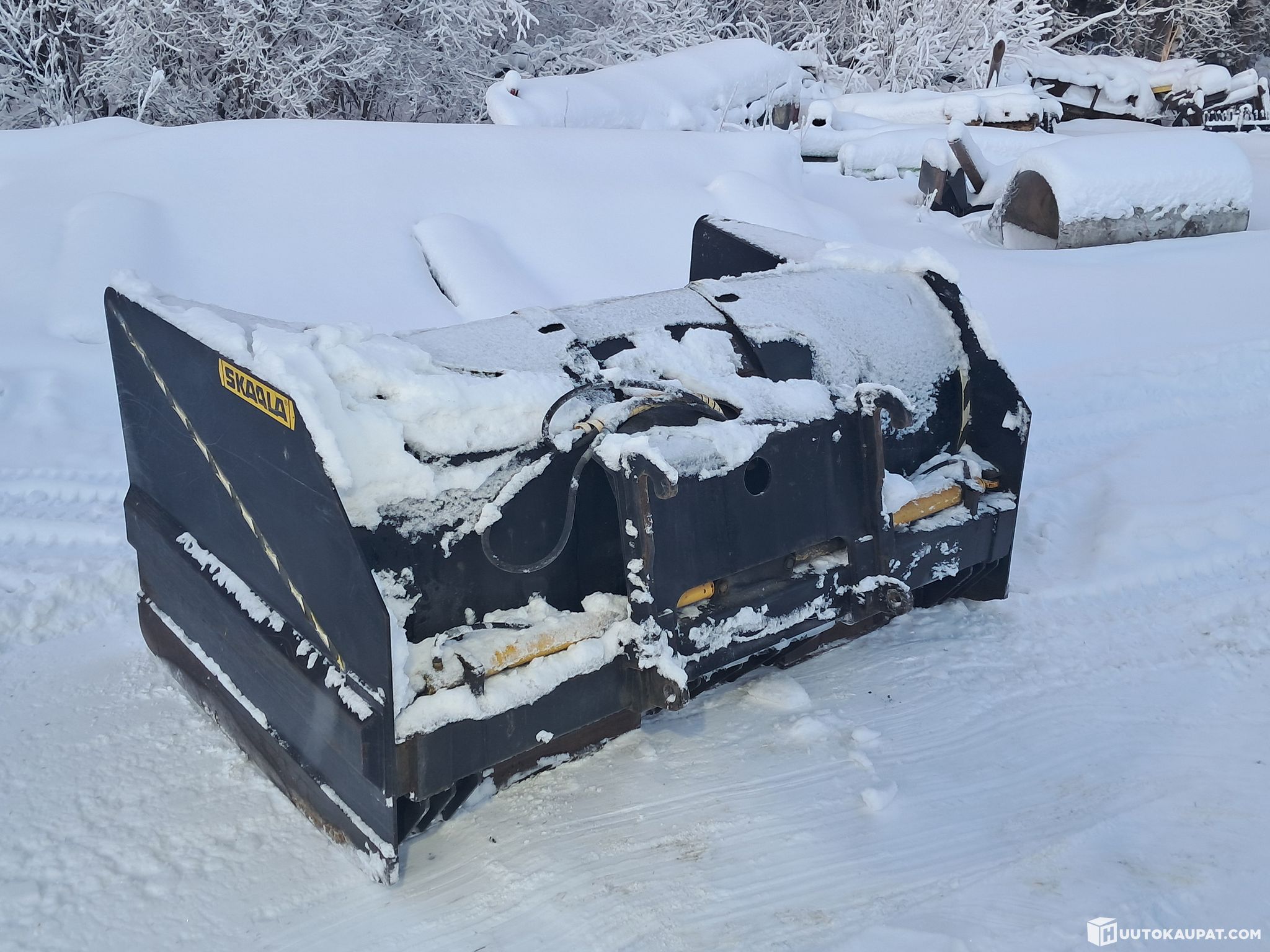Levenevä piha aura. Perusleveys 2.6m levenee 4.6m siiven pituus 1.6m. Aurassa ei ole vaihdettavia teriä saa laitettua kun tekee pulteille reijät. Ei varastointi kuluja voi noutaa kun löytyy sopiva kyyti. Nostetaan kyytiin.