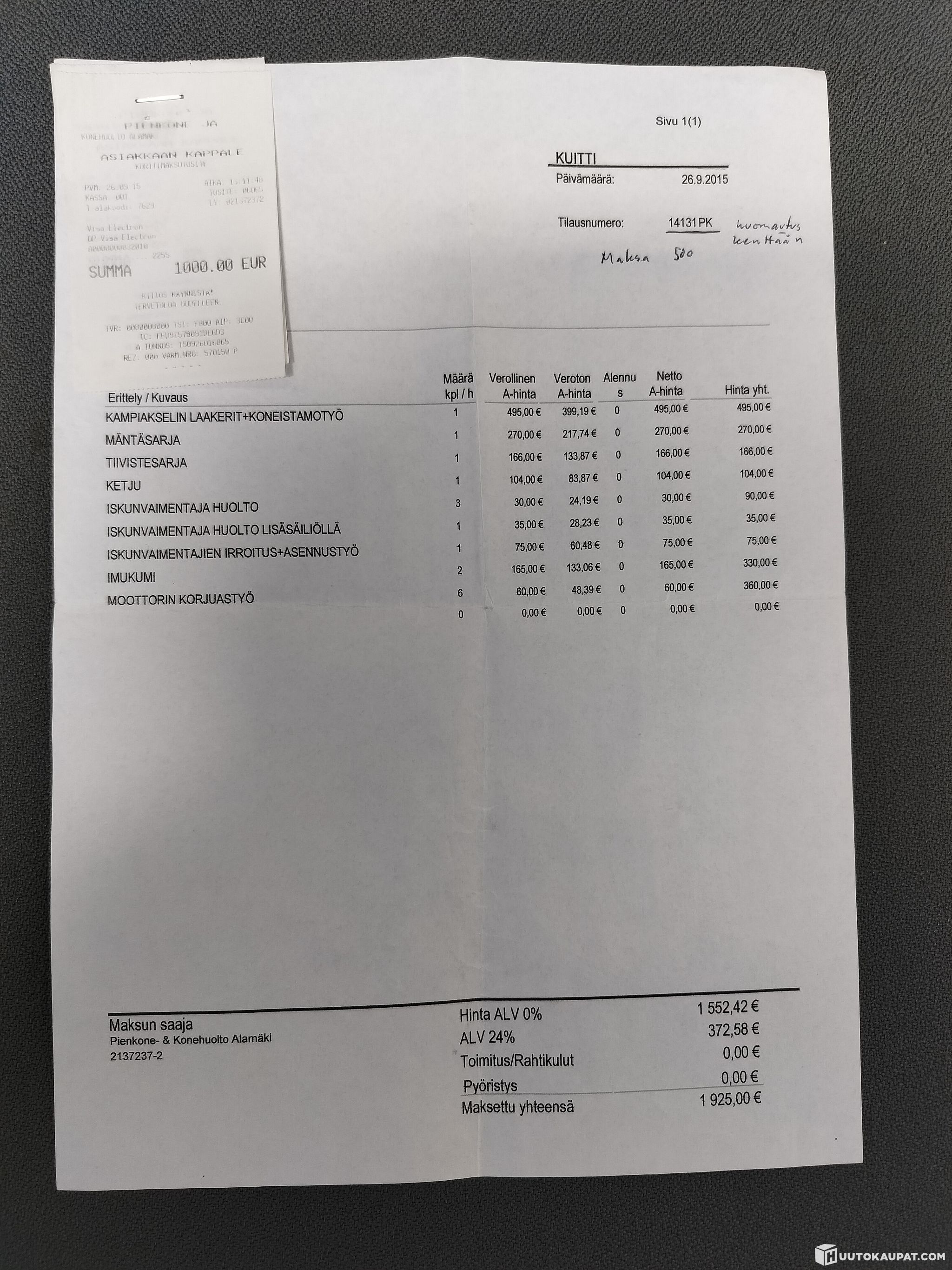 Huoltohistoriasta kuvat alhaalla, mm moottoriremontti tehty 09/2015. Iskarit huollettu 12/2023.
